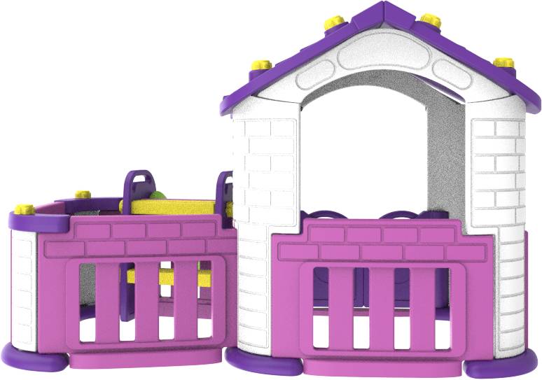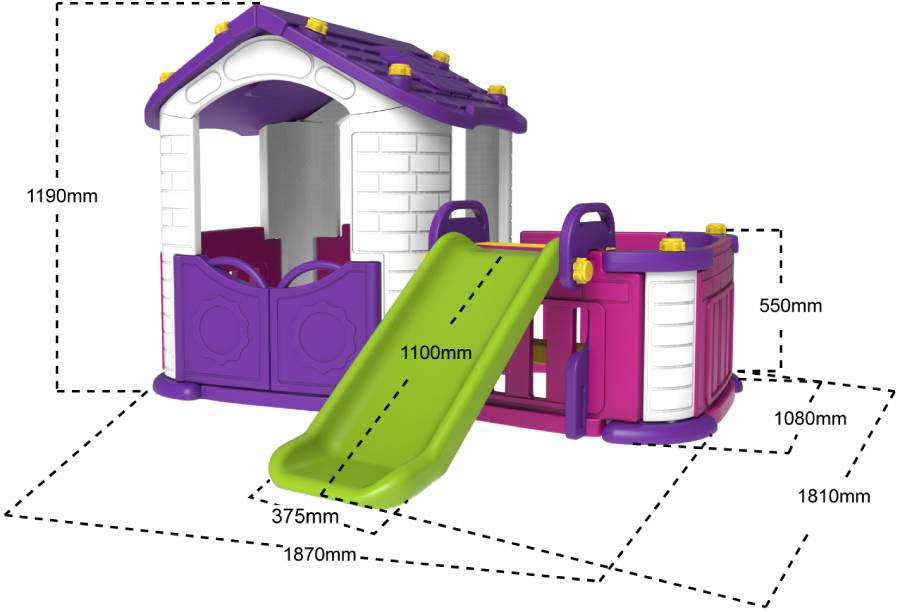 Яркий Игровой домик с горкой универсальной расцветки понравится как мальчикам, так и девочкам. Данная модель дополнена палисадником.