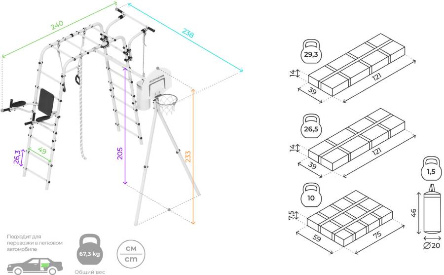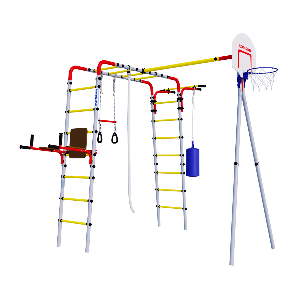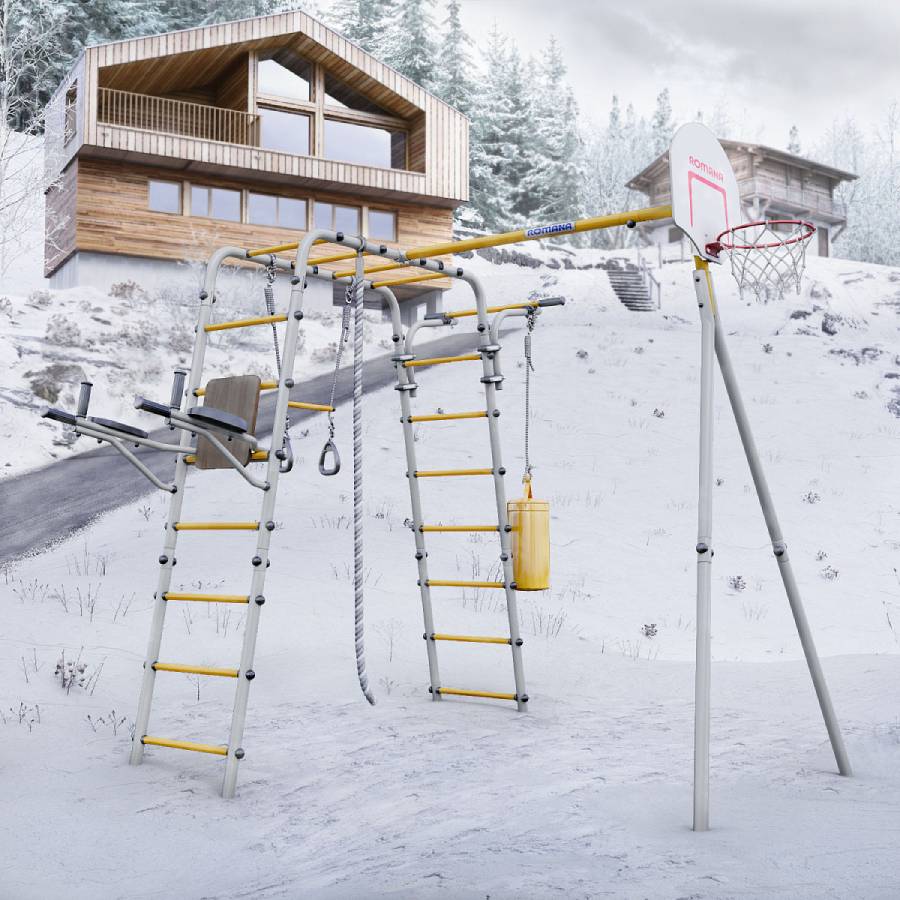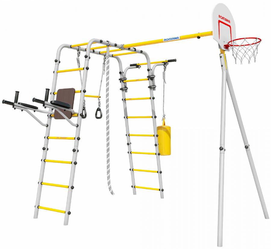 Комплектация: баскетбольный щит, груша боксерская, брусья, канат, кольца с перекладиной, гимнастическая лестница, рукоход, турник подвижный