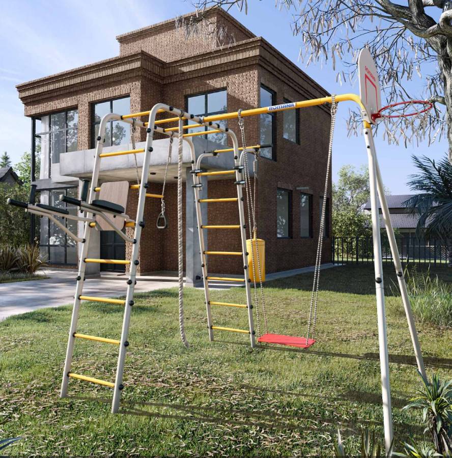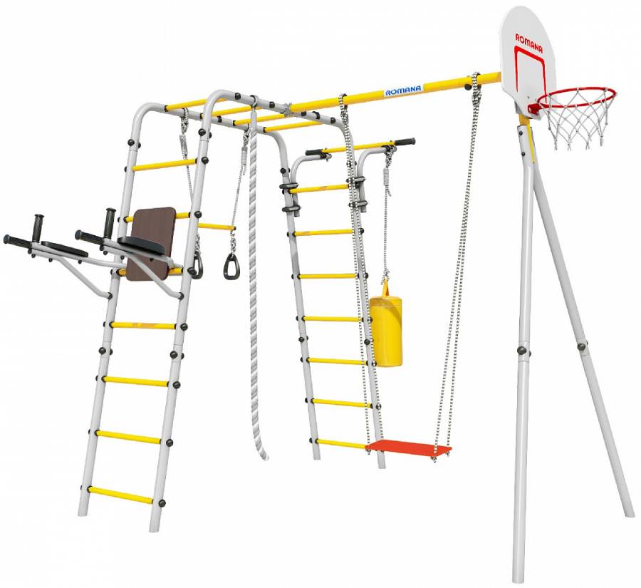 Комплектация: баскетбольный щит, груша боксерская, брусья, канат, кольца с перекладиной, гимнастическая лестница, рукоход, турник подвижный, качели фанерные