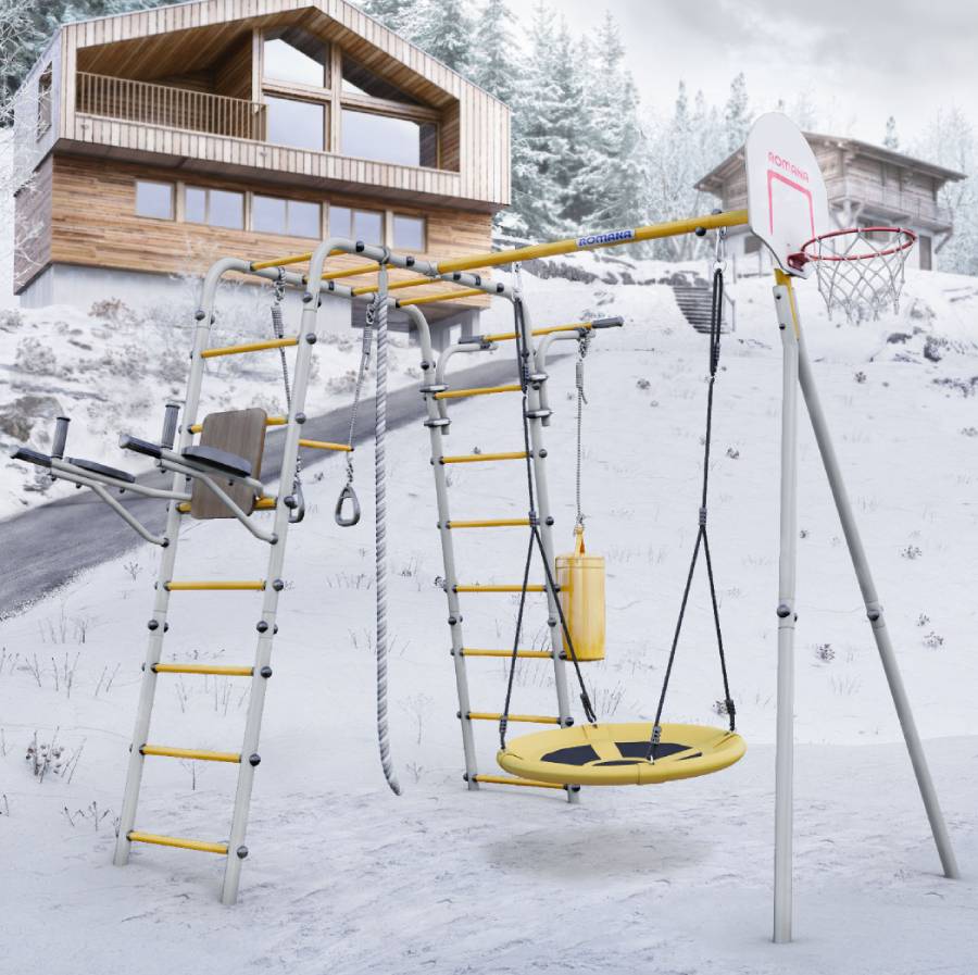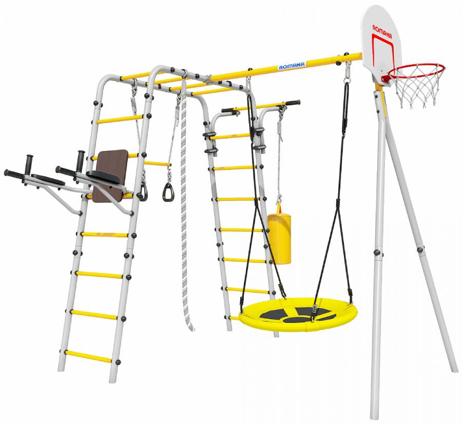 Комплектация: баскетбольный щит, груша боксерская, брусья, канат, кольца с перекладиной, гимнастическая лестница, рукоход, турник подвижный, качели гнездо