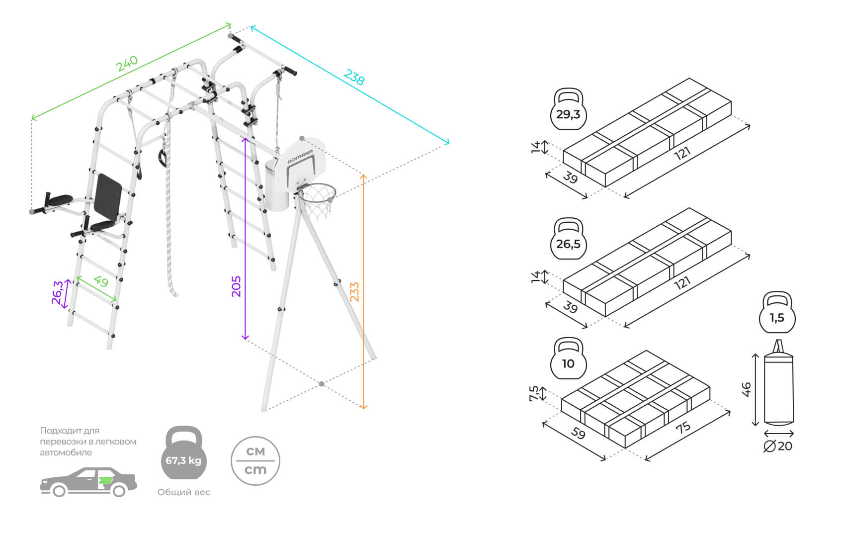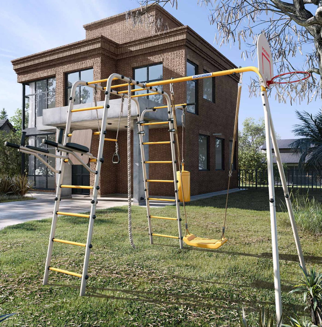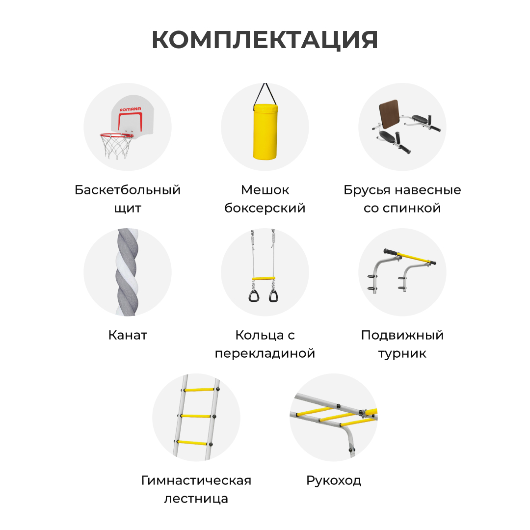 Комплектация: баскетбольный щит, груша боксерская, брусья, канат, кольца с перекладиной, гимнастическая лестница, рукоход, турник подвижный, качели пластиковые