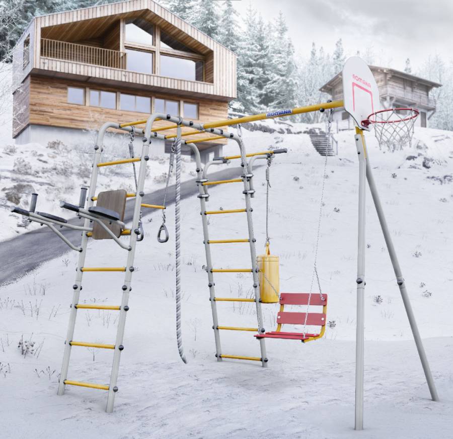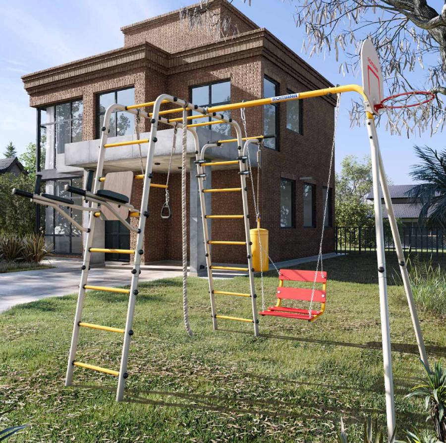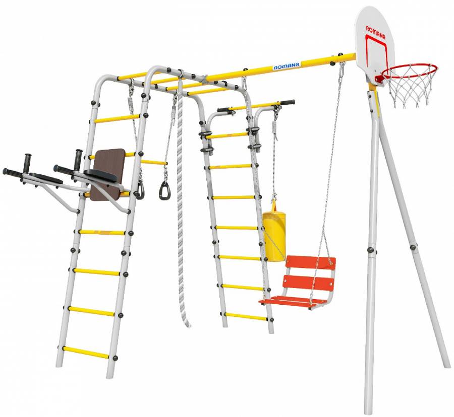 Комплектация: баскетбольный щит, груша боксерская, брусья, канат, кольца с перекладиной, гимнастическая лестница, рукоход, турник подвижный, качели цепные
