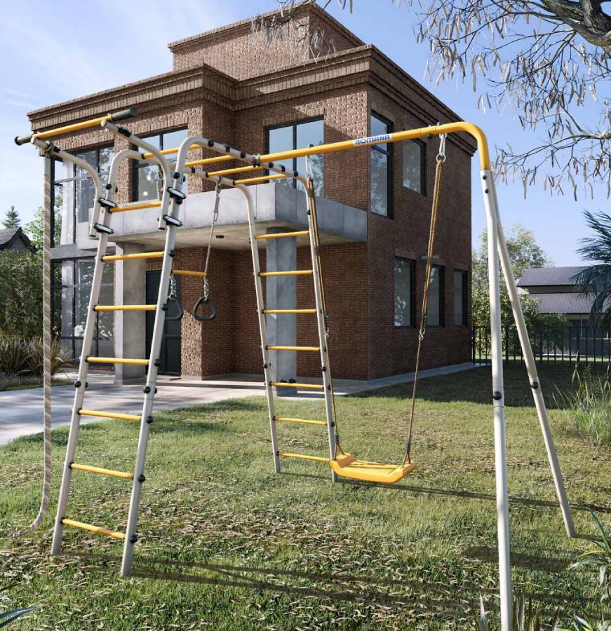Множество спортивных объектов разнообразят активный досуг на свежем воздухе. В комплект включены следующие игровые элементы: канат, гимнастическая лестница, кольца с перекладиной, рукоход, подвижный турник. Подвижная конструкция турника позволяет установить его на удобной для ребенка высоте . Дополнить комплекс можно сеткой лазом, баскетбольным щитом и качелями разных видов. Множество игровых элементов способствует всестороннему физическому и интеллектуальному развитию ребенка.