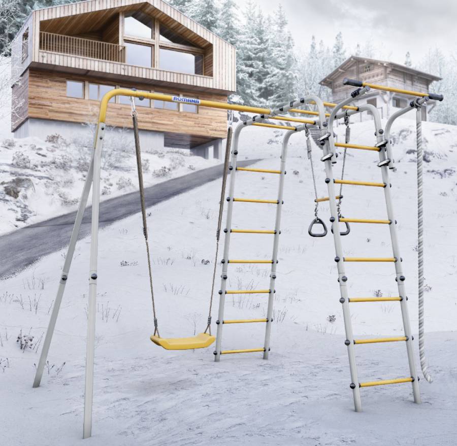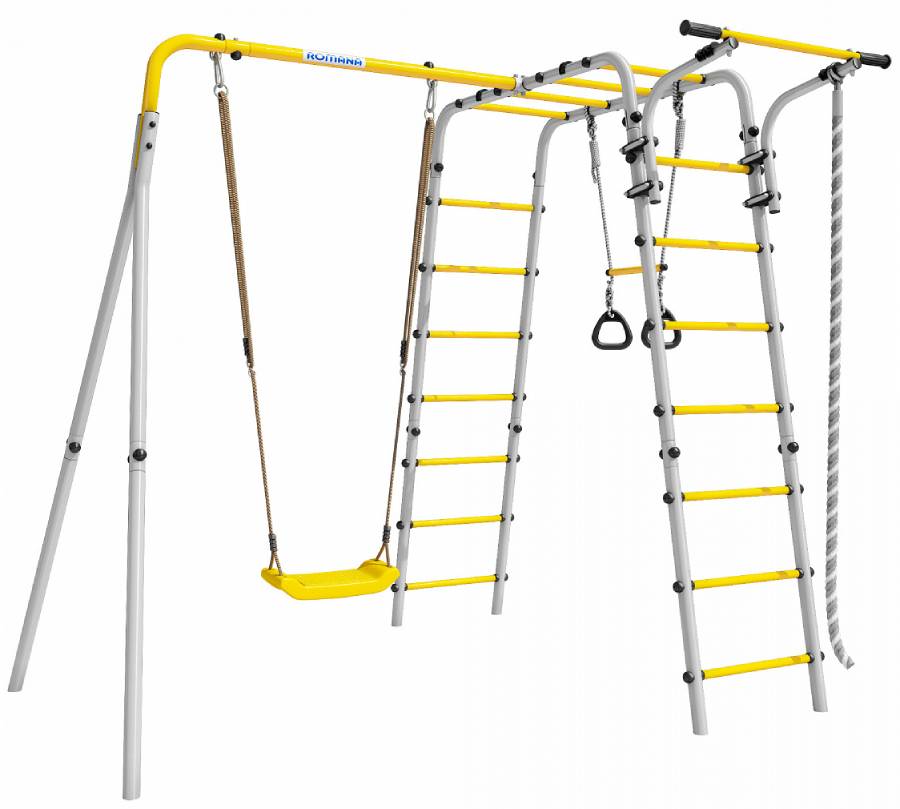 - Комплектация: канат, кольца с перекладиной, гимнастическая лестница, рукоход, турник подвижный, качели пластиковые