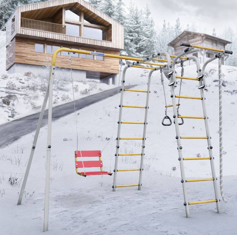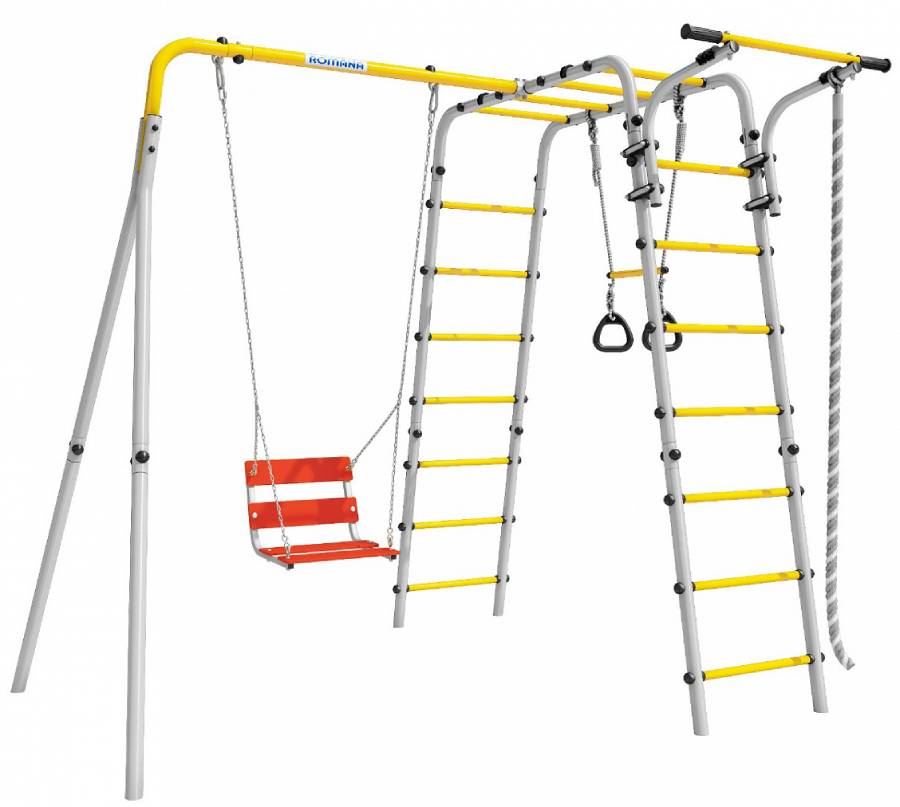 - Комплектация: канат, кольца с перекладиной, гимнастическая лестница, рукоход, турник подвижный, качели цепные