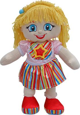 - мягконабивная куколка в ярком платье и очаровательными волосами из шерстяных нитей