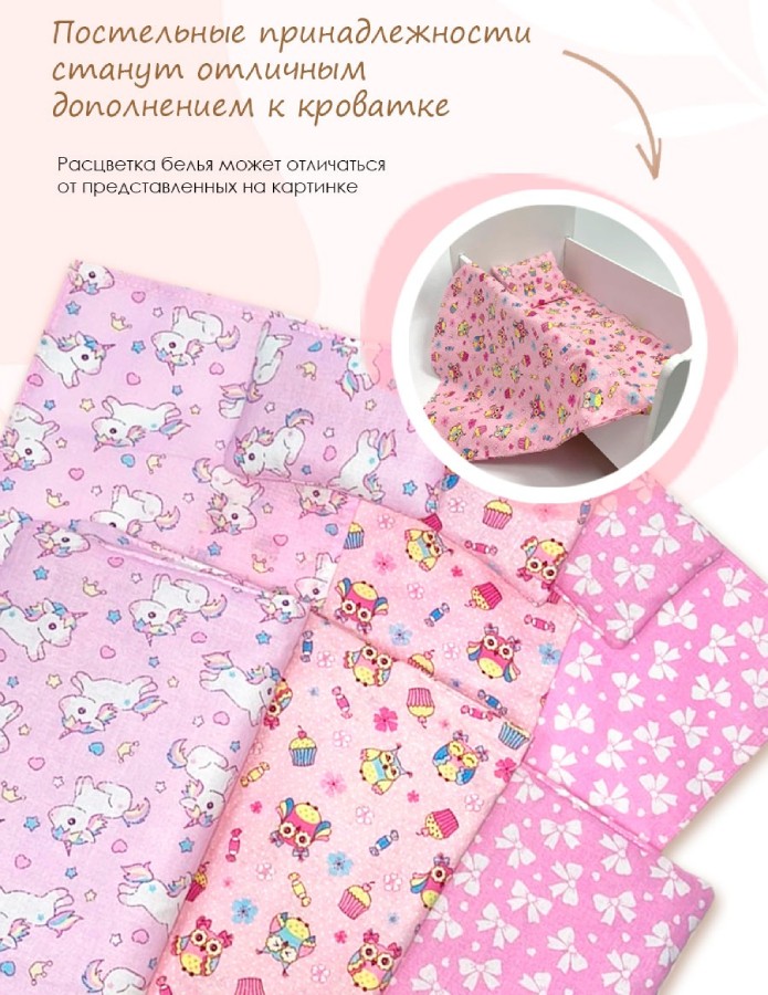- Материал кроватка - МДФ 8 мм, покрытие эмаль; постельное белье - хлопок 100%