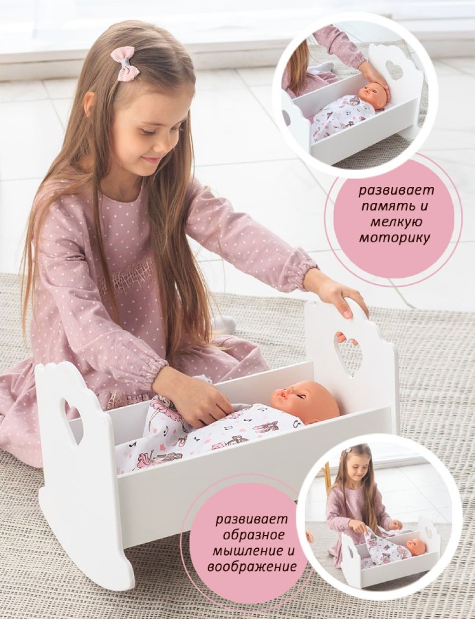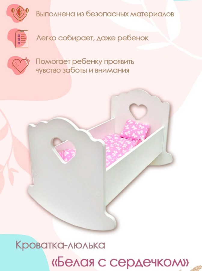 У вас появилась уникальная возможность приобрести удивительную игрушку - кроватку в виде красивого сердца! Эта уютная и нежная кроватка-люлька идеальна для маленьких кукол длиной 43 см. Она порадует не только детей, но и взрослых своим оригинальным дизайном и большим сердцем в центре. Эта сердечная кроватка станет настоящим украшением комнаты вашей малышки или замечательным подарком для этого праздничного сезона!