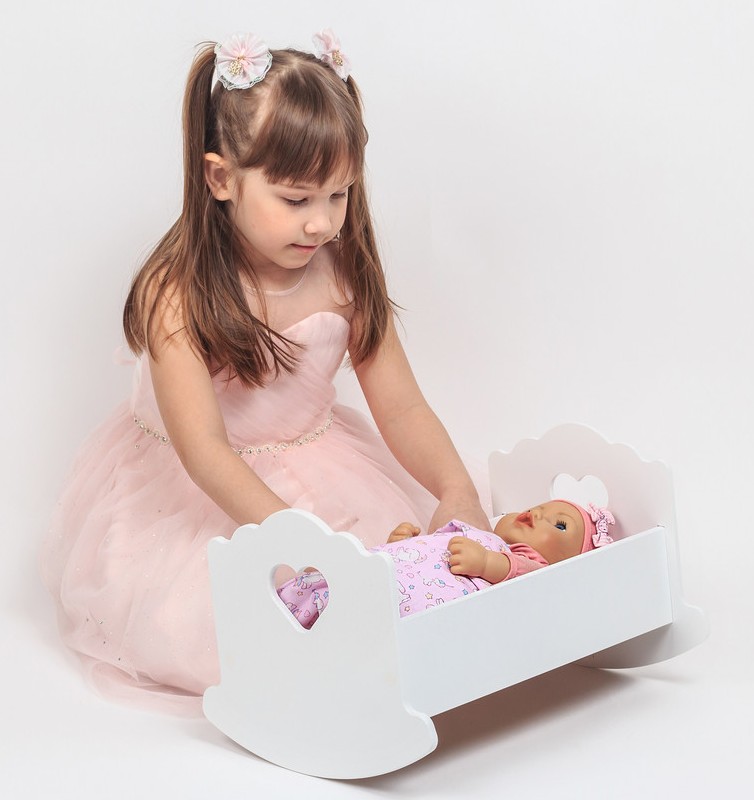 Кроватка-люлька Сердечко белого цвета предназначена для игр с куклами до 42 см. Такая очаровательная люлька - необходимый атрибут для каждой девочки, ведь у каждой маленькой принцессы есть куклы, а для кукол необходима кроватка, чтобы качать и укладывать спать. Кроме того, прекрасно вписывается в интерьер детской комнаты.