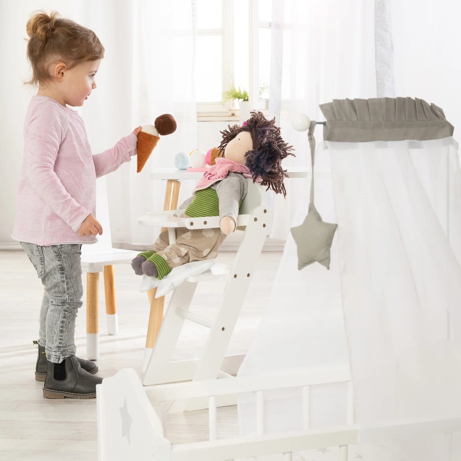 К ЭТОЙ КУКЛОЙ КРОВАТИ С WIEGEFUNKTION доступна ДОПОЛНИТЕЛЬНАЯ кукольная мебель из нашей серии кукольной мебели «Стелла». Хорошая игрушка-каталка для детей от 3 лет.