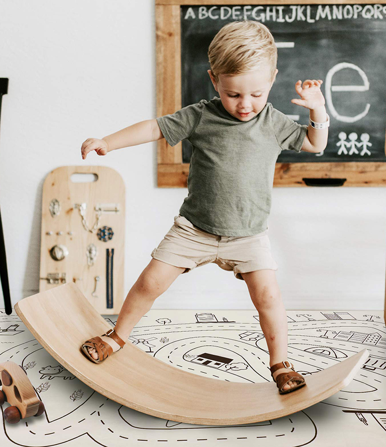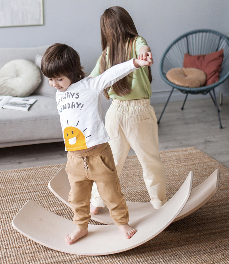 Вот Балансборд, который развивает равновесие, мышцы и воображение! Удержать равновесие, стоя на балансировочной доске, весьма непросто. Это изогнутая неустойчивая доска, которая требует координации, чтобы удержаться на ней. Это простое приспособления идеально для совершенствования равновесия и баланса, которое обязательно увлечет ребенка.