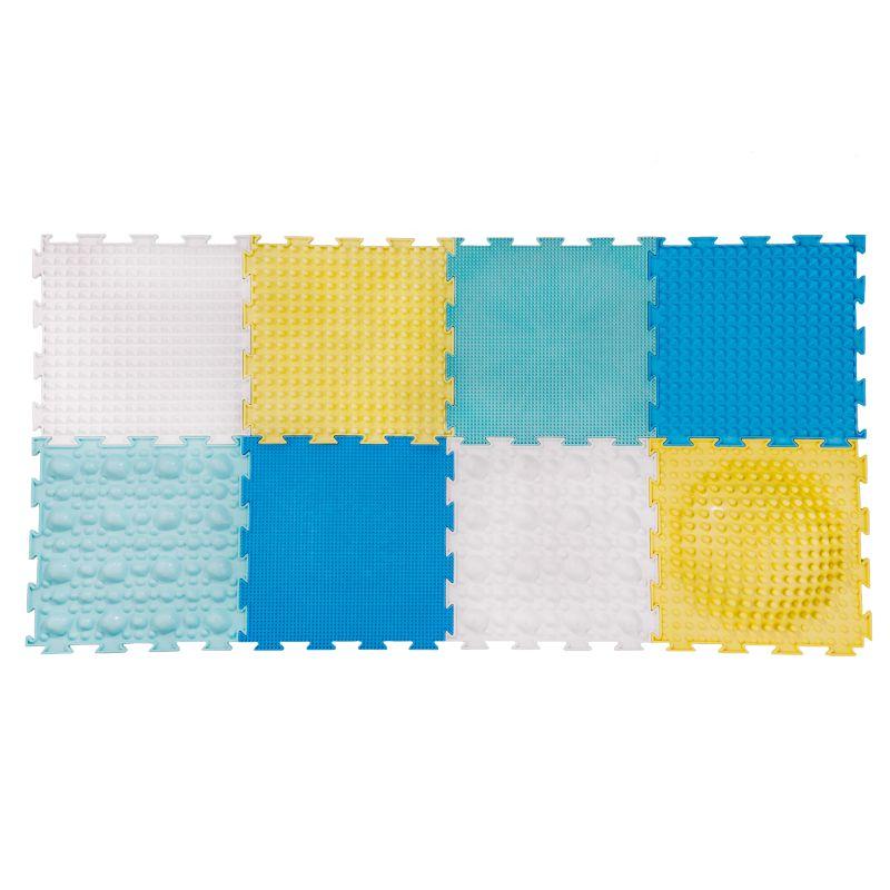 Набор модульных ковриков Чистюля с развивающим и профилактическим покрытием представляет собой квадратные модули с бугристой поверхностью со множеством пирамидок, вершины которых расположены на одном уровне. Цветовая гамма этого комплекта выполнена в холодных тонах, напоминающих льдинки. Благодаря различной фактуре и жесткости поверхности, коврики стимулируют все необходимые рецепторы стопы ребенка, способствуя формированию ее физиологических сводов.