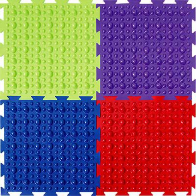Набор модульных ковриков Камешки мягкий с развивающим и профилактическим ПВХ-покрытием представляет собой квадратные модули с бугристой поверхностью. Элементы, расположенные на поверхности ковриков, имеют различную высоту и форму. Благодаря различной фактуре и жесткости поверхности, коврики стимулируют все необходимые рецепторы стопы ребенка, способствуя формированию ее физиологических сводов.