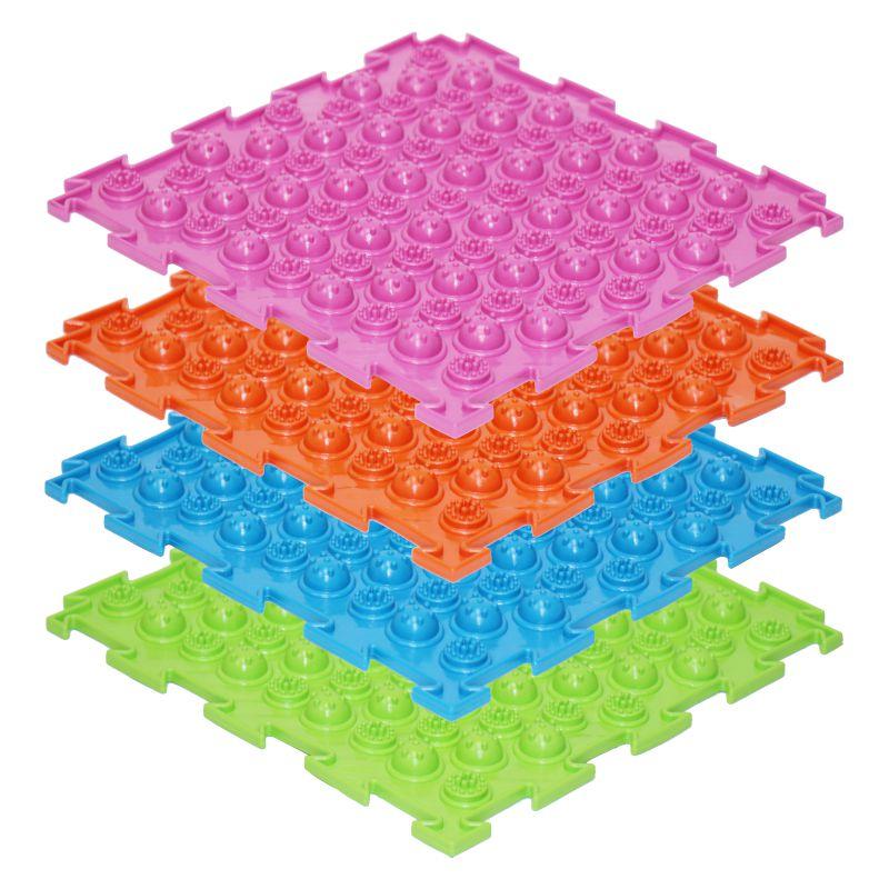 Набор модульных ковриков Колючки мягкий с развивающим и профилактическим ПВХ-покрытием представляет собой квадратные модули с бугристой поверхностью. Элементы, расположенные на поверхности ковриков, имеют различную высоту и форму. На данных модулях поверхность покрыта полусферами с маленькими шипами, напоминающими колючки. В отличие от настоящих колючек, по этим коврикам приятно ходить, особенно по утрам для скорейшего пробуждения. Благодаря различной фактуре и жесткости поверхности, коврики стимулируют все необходимые рецепторы стопы ребенка, способствуя формированию ее физиологических сводов.