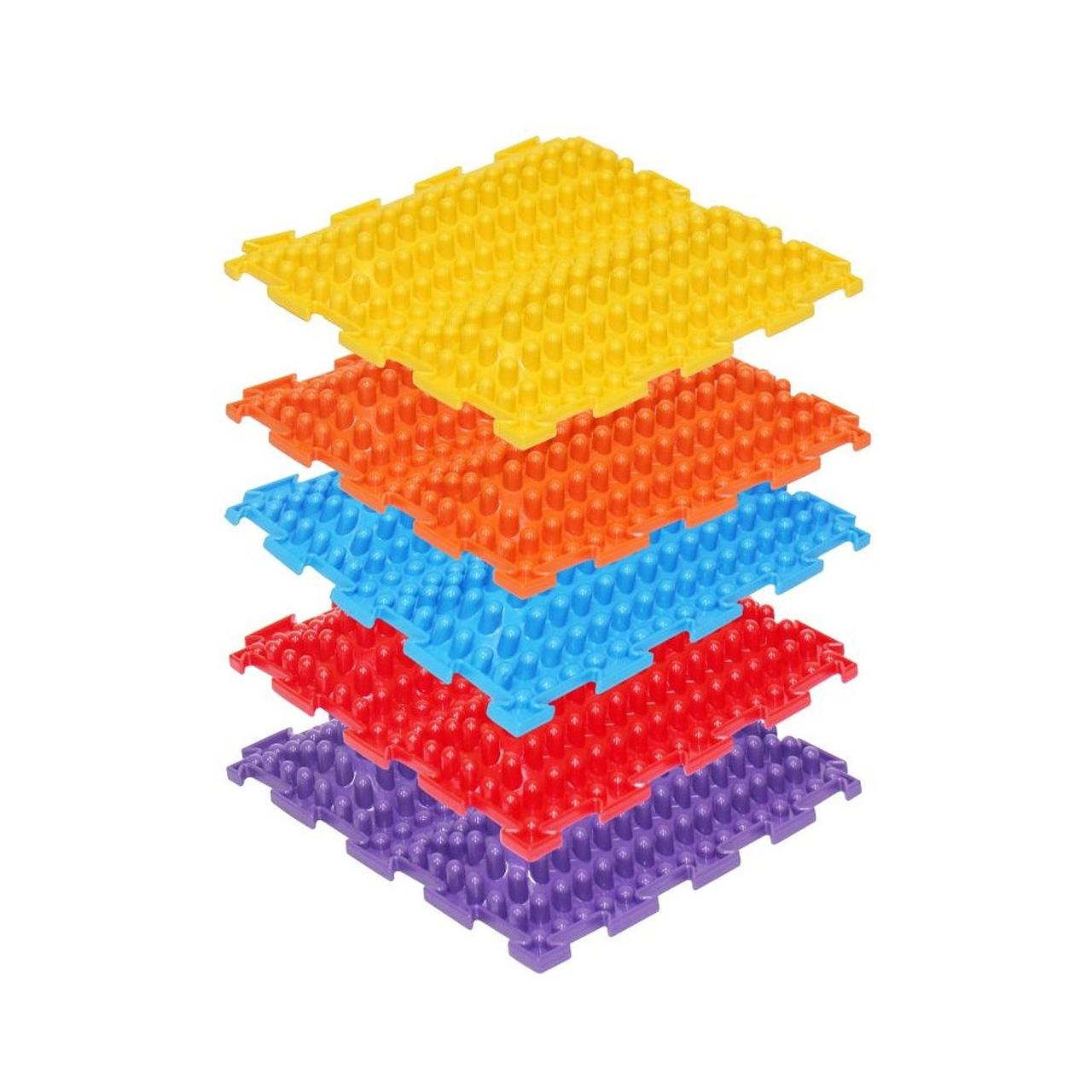 Набор модульных ковриков Волна жесткий с развивающим и профилактическим ПВХ-покрытием представляет собой квадратные модули с бугристой поверхностью. Элементы, расположенные на поверхности ковриков, имеют различную высоту и форму. Благодаря различной фактуре и жесткости поверхности, коврики стимулируют все необходимые рецепторы стопы ребенка, способствуя формированию ее физиологических сводов.