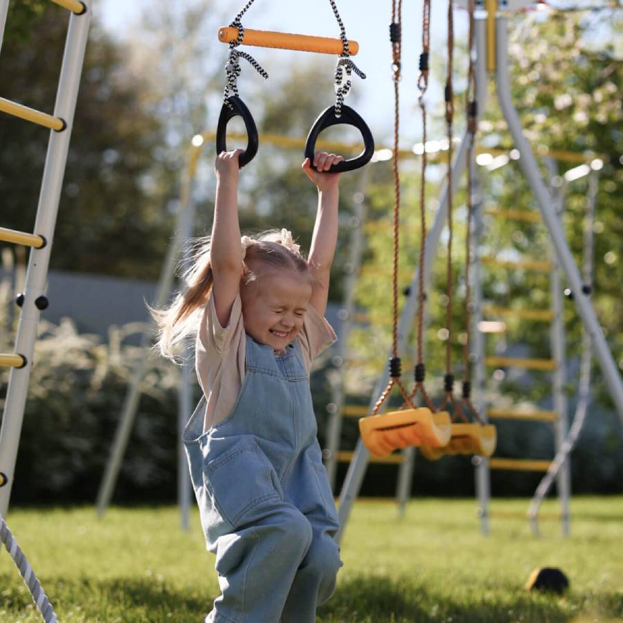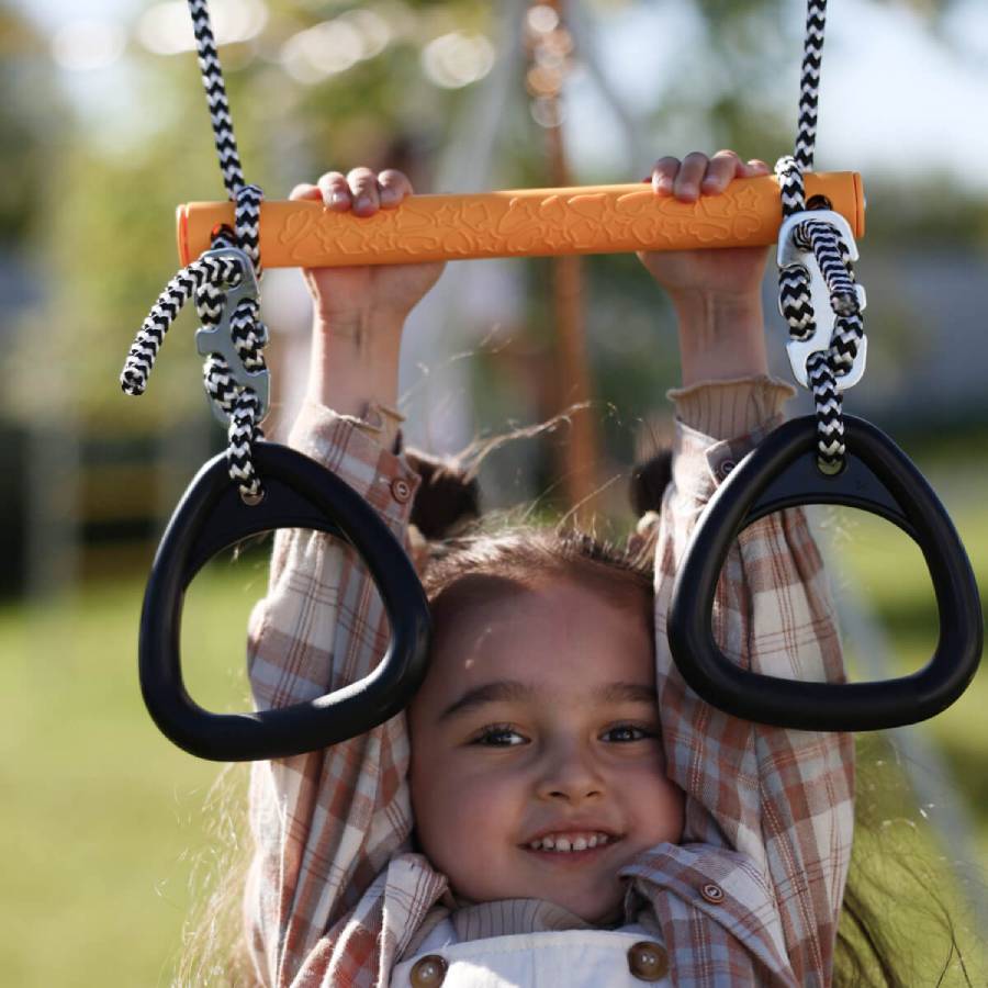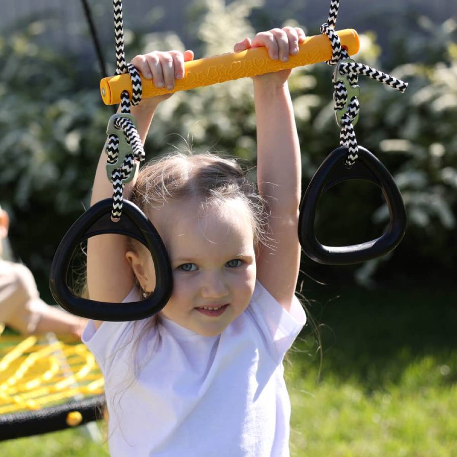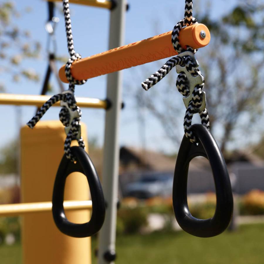 Кольца могут быть первым спортивным аксессуаром малыша! Данный снаряд используется с раннего возраста для укрепления разных групп мышц. На кольцах можно висеть, хватаясь руками или ногами. Кроме того, кольца можно использовать как дополнительную опору во время лазания по спорткомплексу.