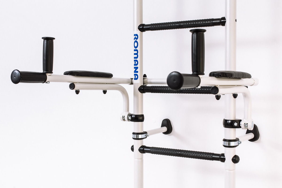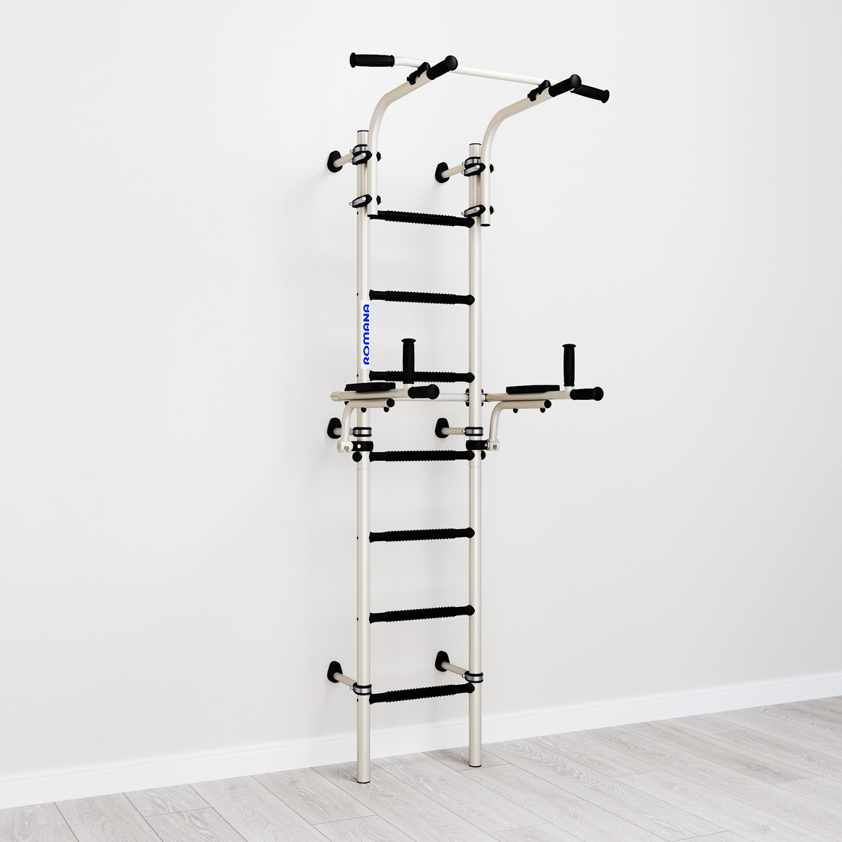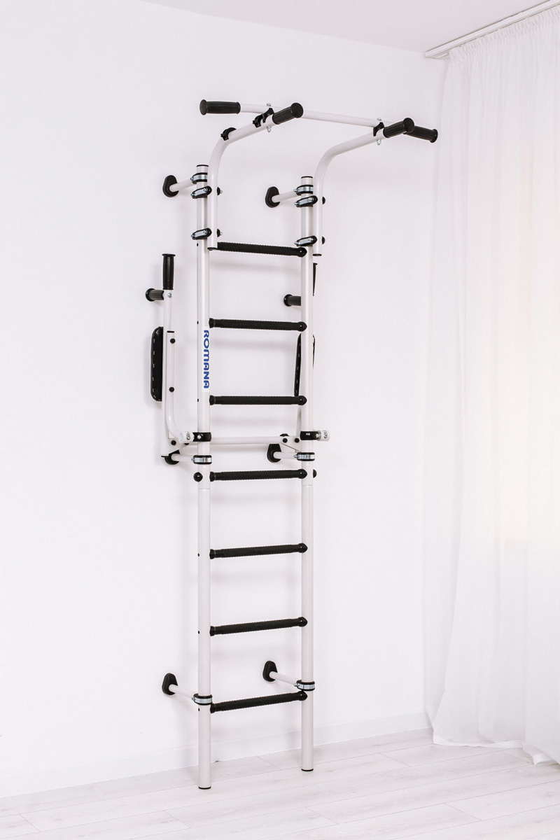 ROMANA S10 - домашний спортивный комплекс для всей семьи, на нем могут заниматься и дети, и взрослые. Он достаточно компактен и не занимает много места: ширина ступеней составляет 410 мм, это самый оптимальный размер для занятий на брусьях, которые идут в комплекте. Брусья откидные, и после занятий их можно перевести в вертикальное положение. Турник можно передвигать по высоте, и закрепить как удобно пользователю с помощью надежных современных хомутов. Спортивный комплекс фиксируется к стене, фиксаторы можно передвигать по вертикали, чтобы избежать попадания в проводку или полости.