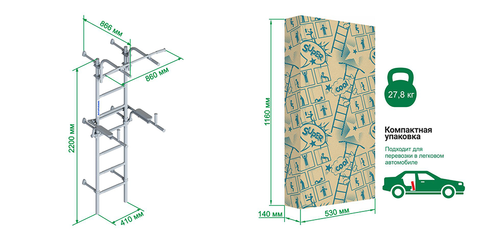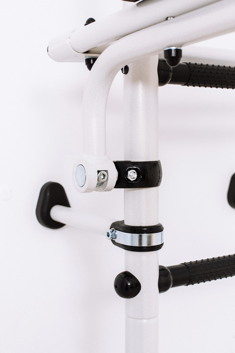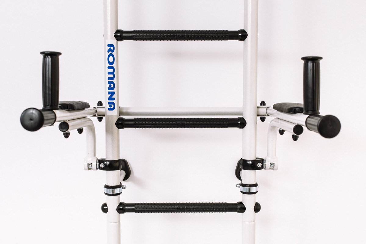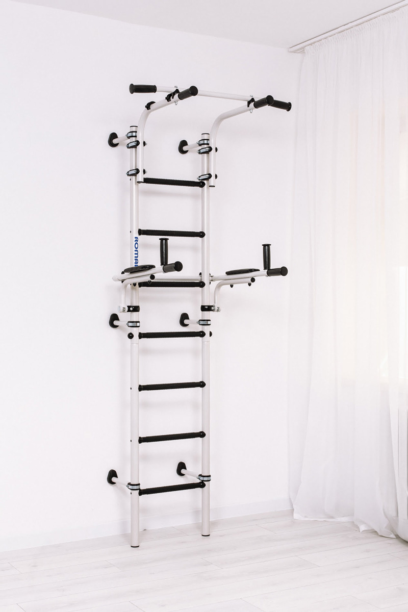 ROMANA S10 - домашний спортивный комплекс для всей семьи, на нем могут заниматься и дети, и взрослые. Он достаточно компактен и не занимает много места: ширина ступеней составляет 410 мм, это самый оптимальный размер для занятий на брусьях, которые идут в комплекте. Брусья откидные, и после занятий их можно перевести в вертикальное положение. Турник можно передвигать по высоте, и закрепить как удобно пользователю с помощью надежных современных хомутов. Спортивный комплекс фиксируется к стене, фиксаторы можно передвигать по вертикали, чтобы избежать попадания в проводку или полости.