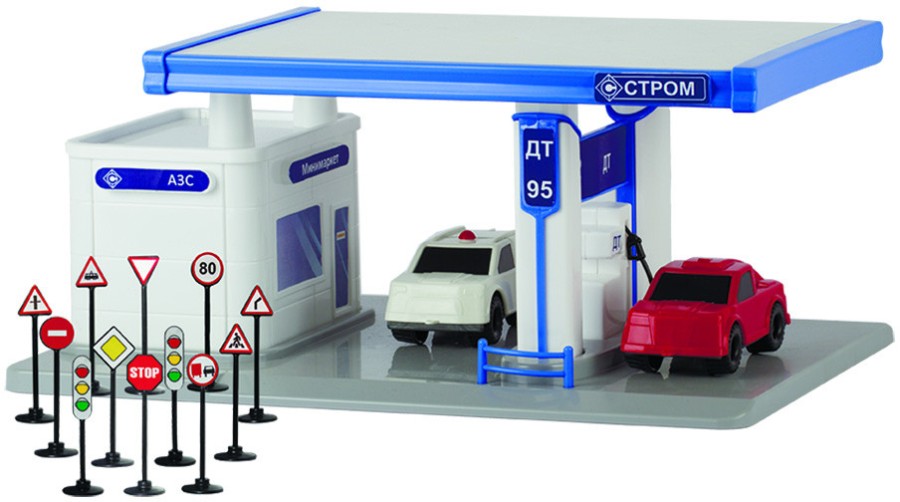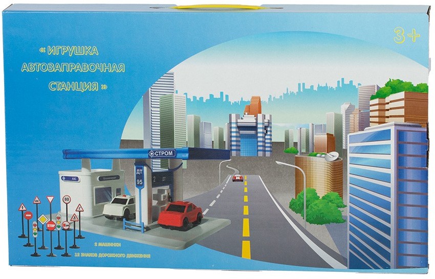 В комплект входят: станция заправки , 2 автомобиля и 12 знаков дорожного движения, которые помогут ребёнку создать много интересных игровых сюжетов, развивая воображение и знакомясь с правилами дорожного движения и социального общения. Игрушка поставляется в разобранном виде. Игрушка изготовлена из высококачественных материалов. Изделие проверено на соответствие требованиям технических регламентов Таможенного Союза и имеет сертификацию ЕАС.