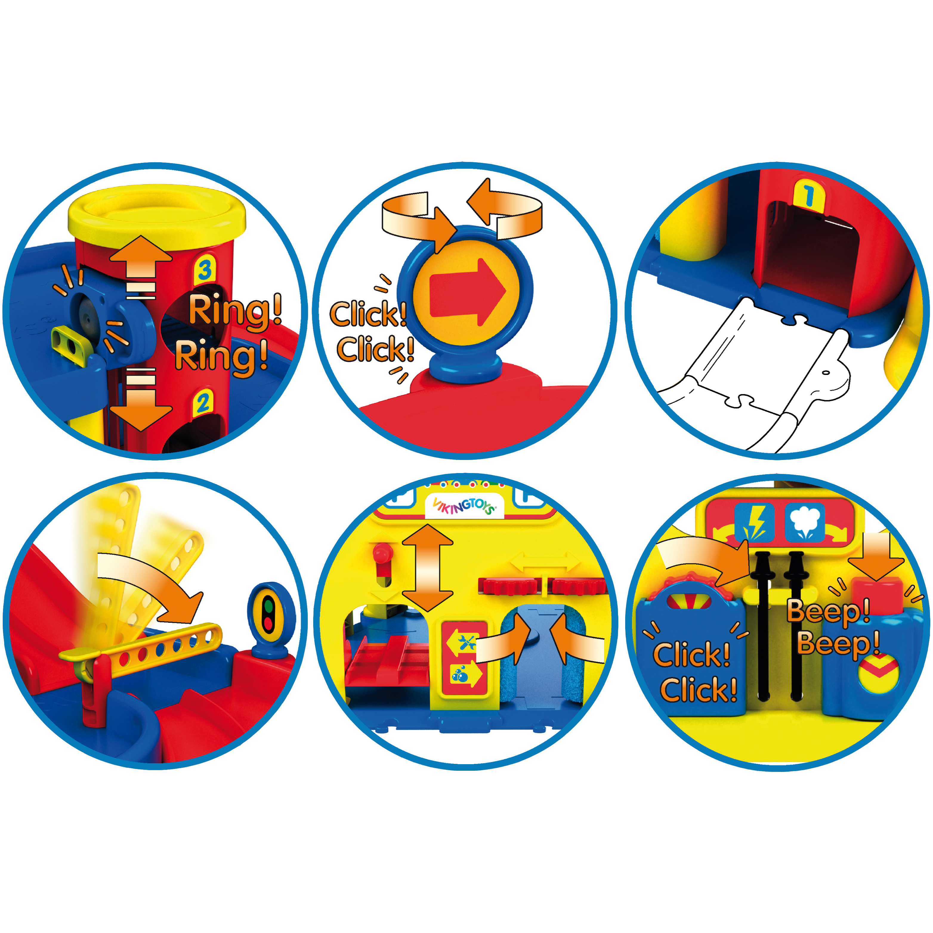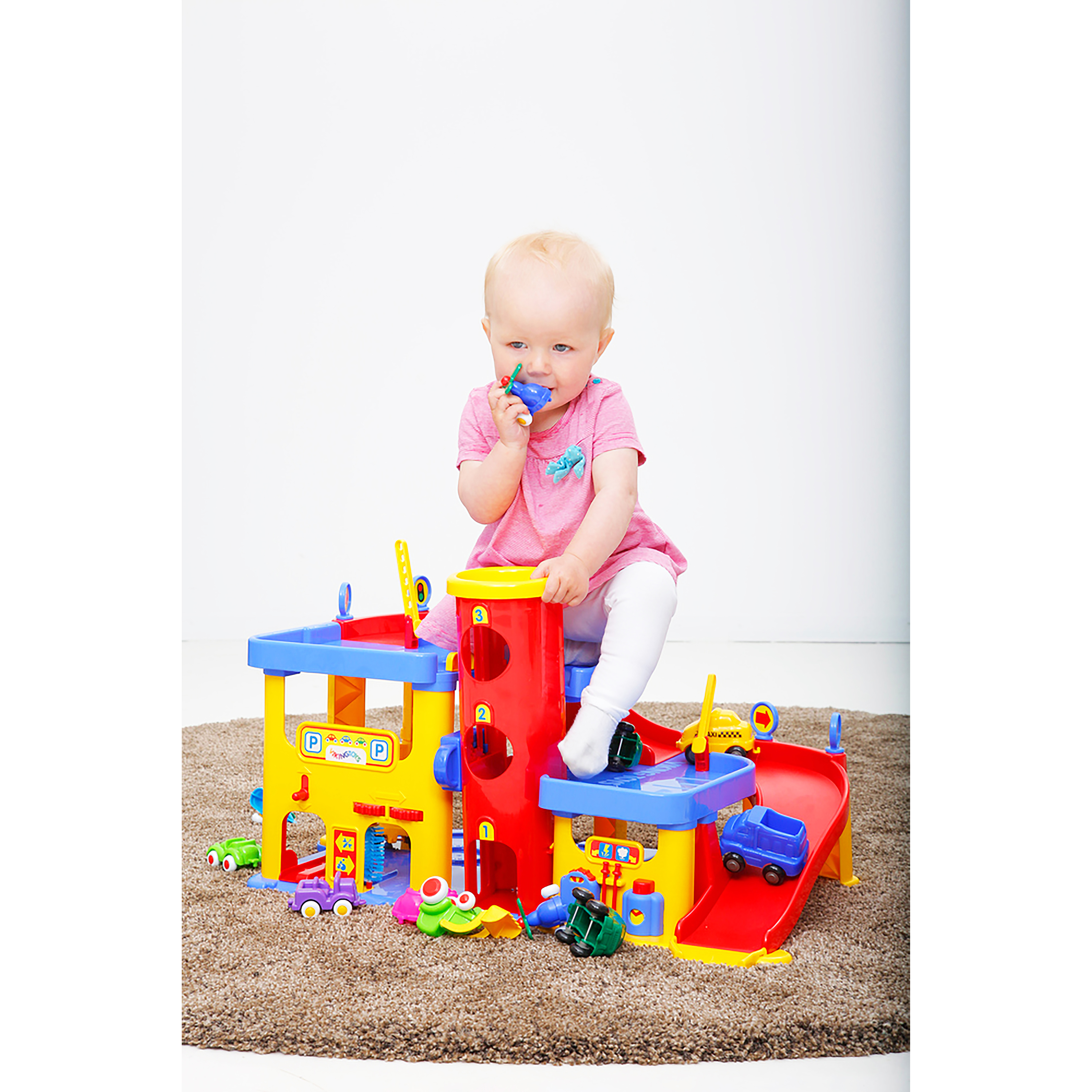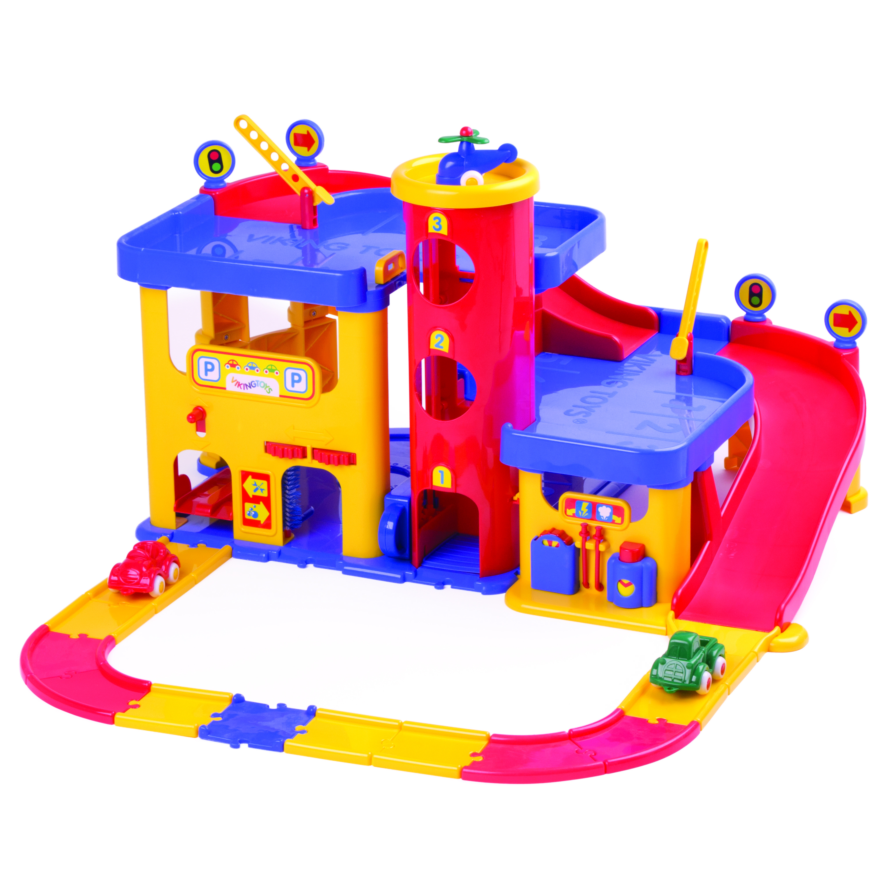 Прочный гараж Viking City с закругленными формами выдерживает нагрузку до 100кг! Интересные функции для увлекательной игры: эстакада, лифт, шлагбаумы, мойка, СТО, заправка, 2 машинки и вертолет.