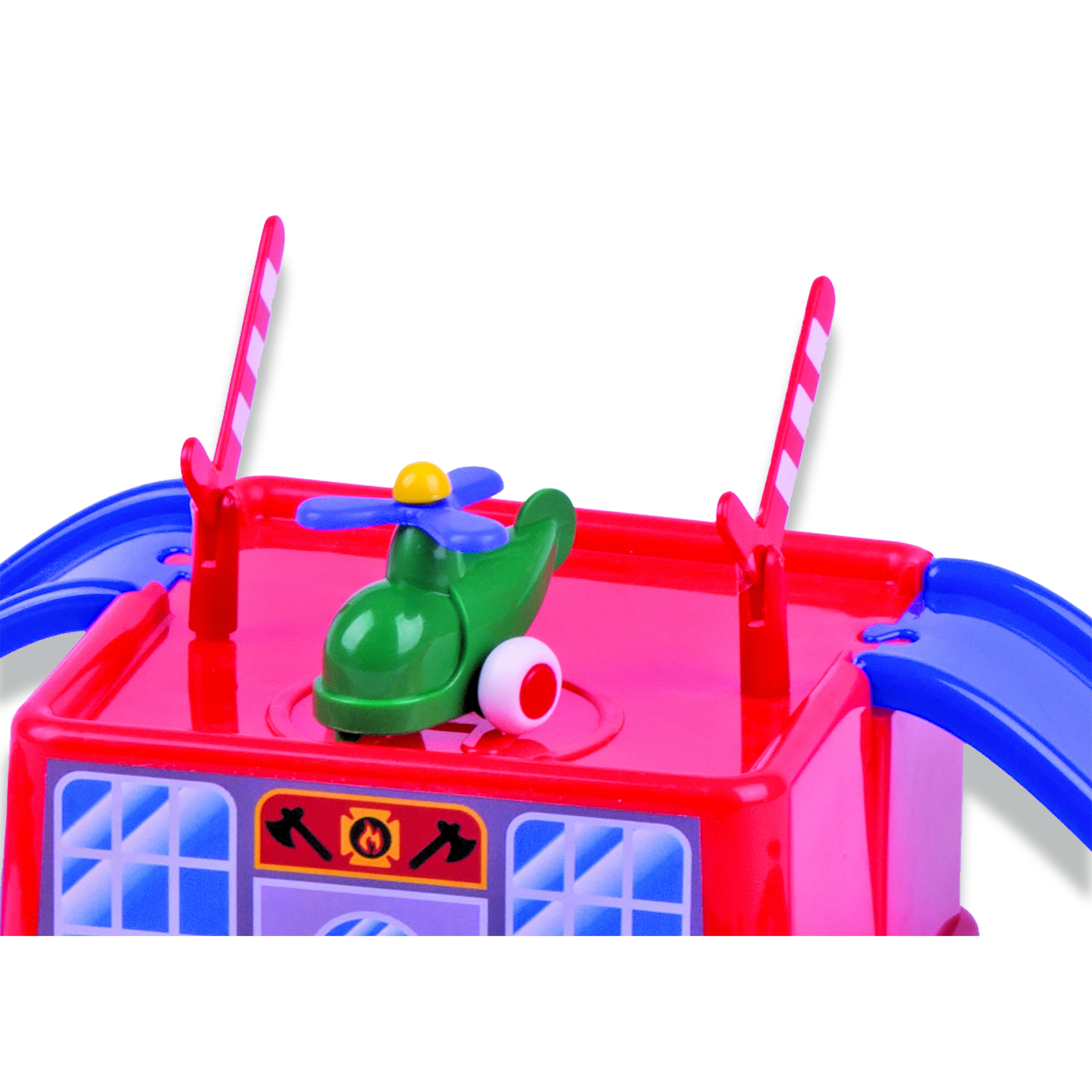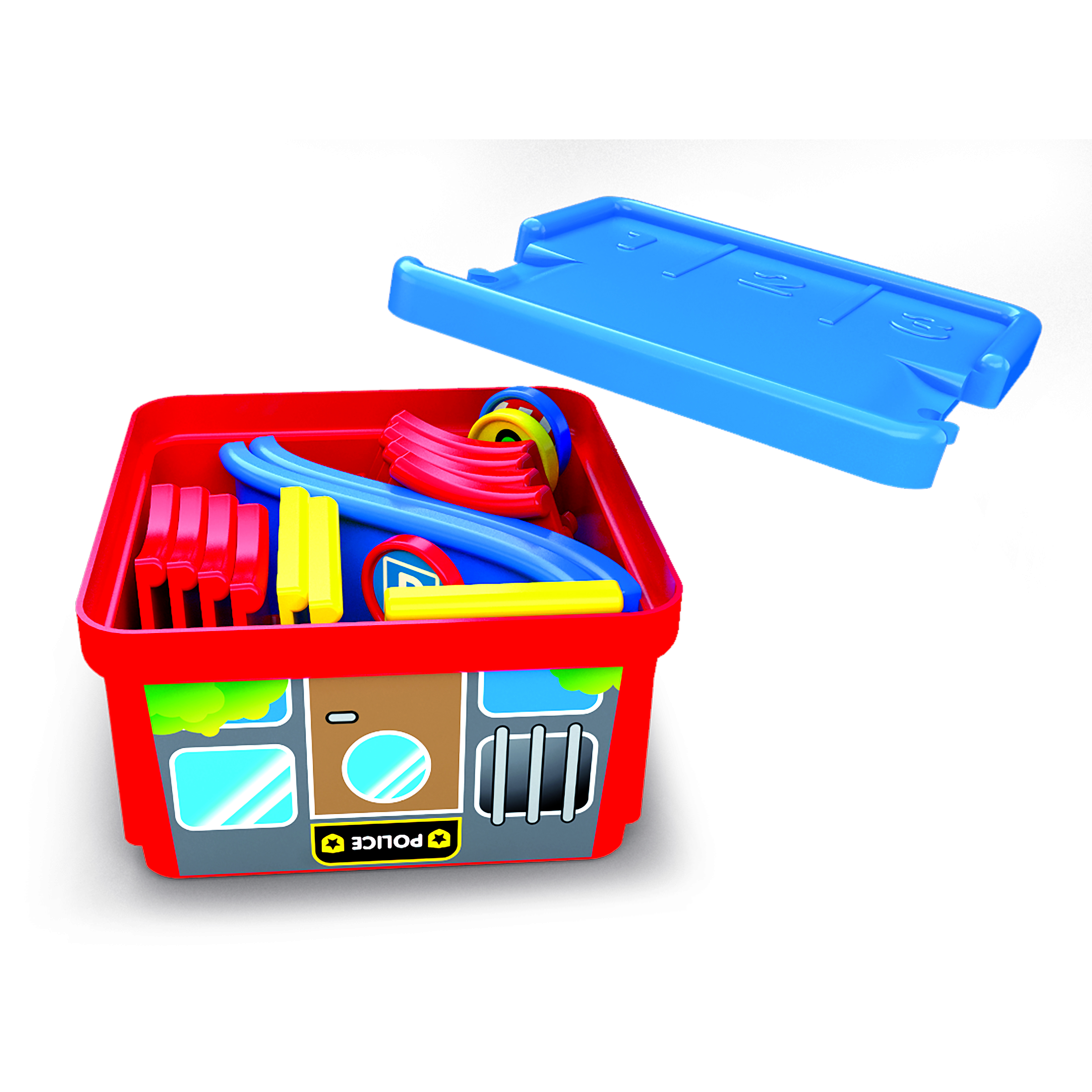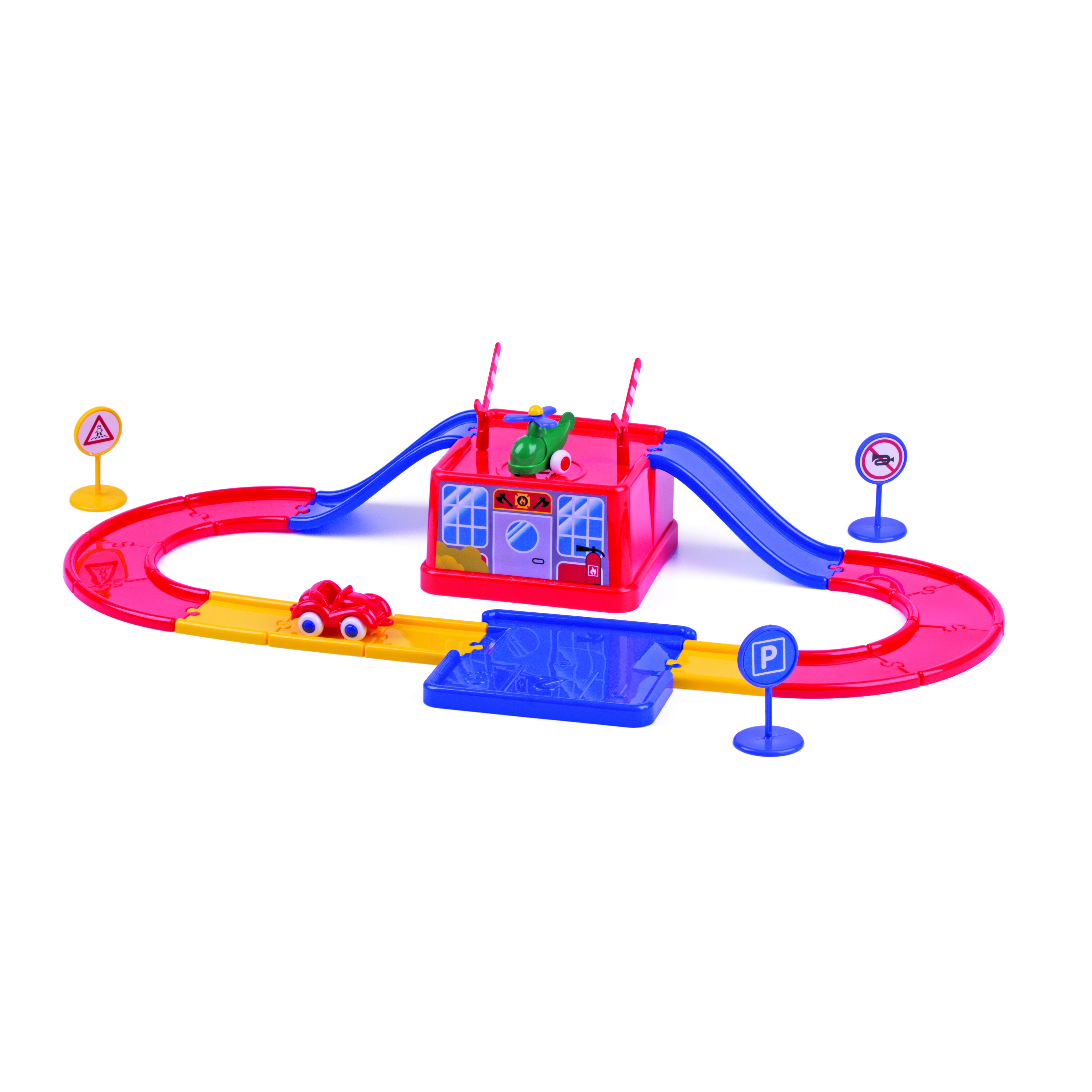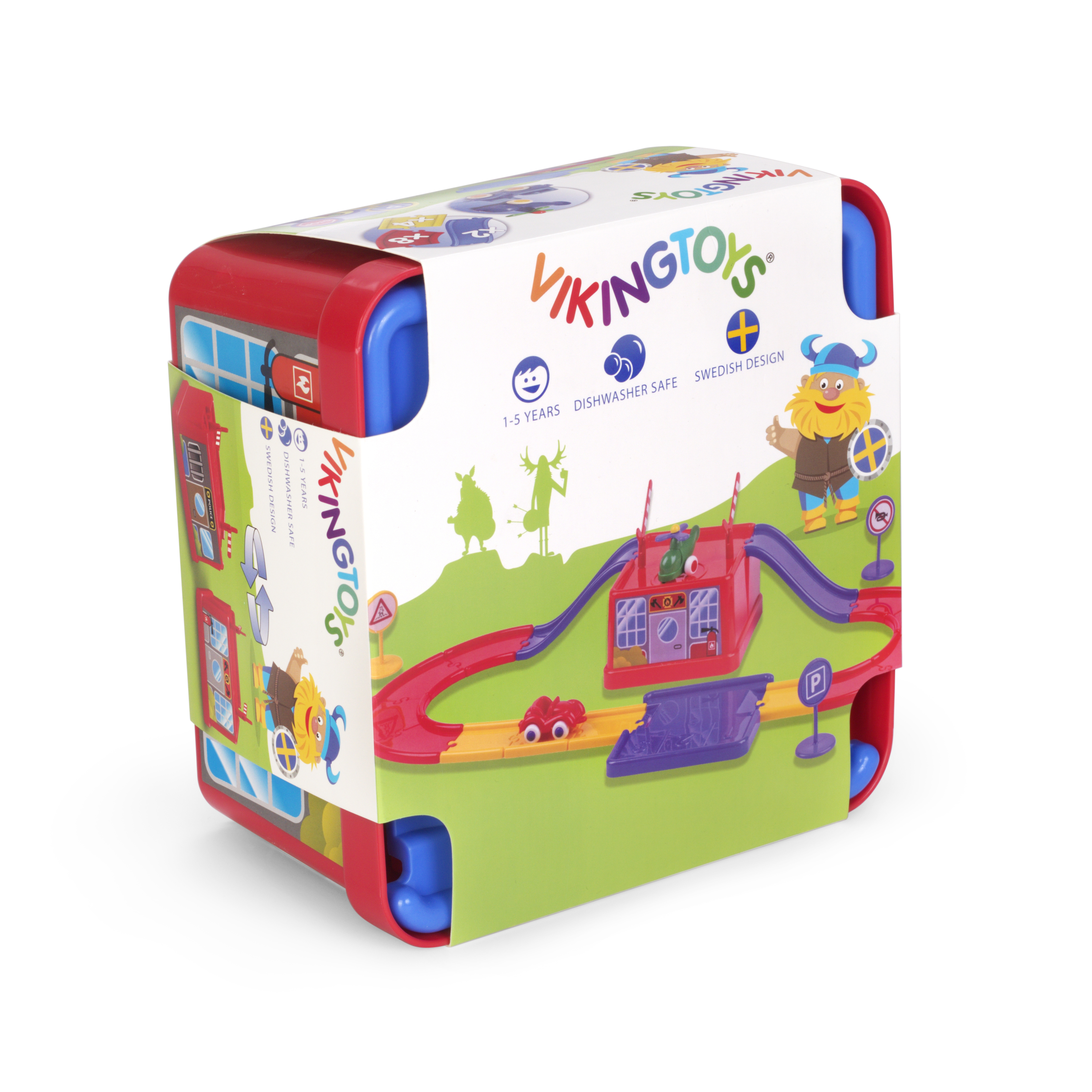 Базовый набор Viking City - это одновременно игровая среда, город Viking City и контейнер для хранения набора. Набор включает: парковка/вертолетная площадка, 12 элементов дороги, 2 рампы, 3 дорожных знака, машинка, вертолет, 2 шлагбаума.