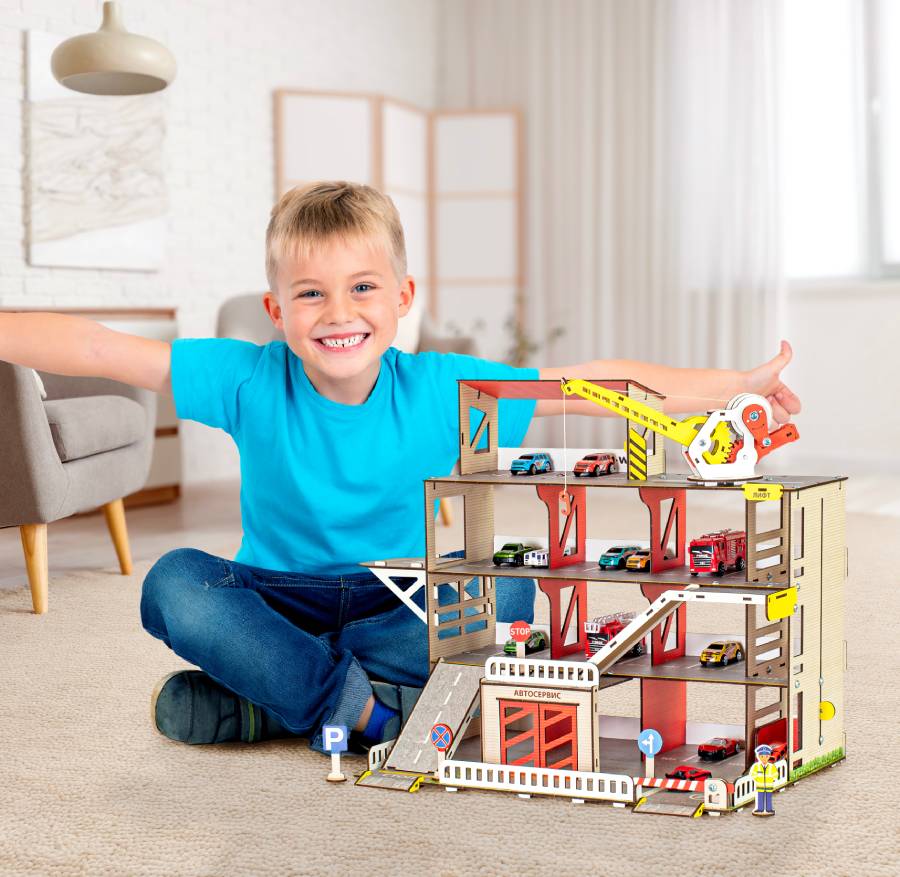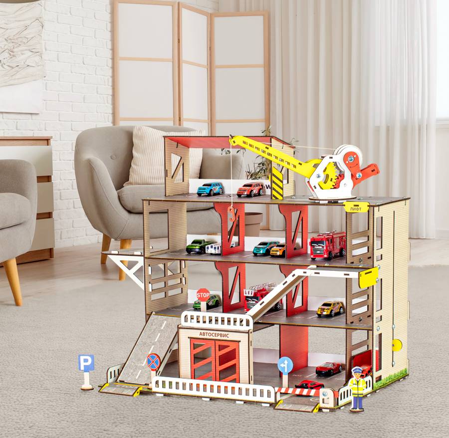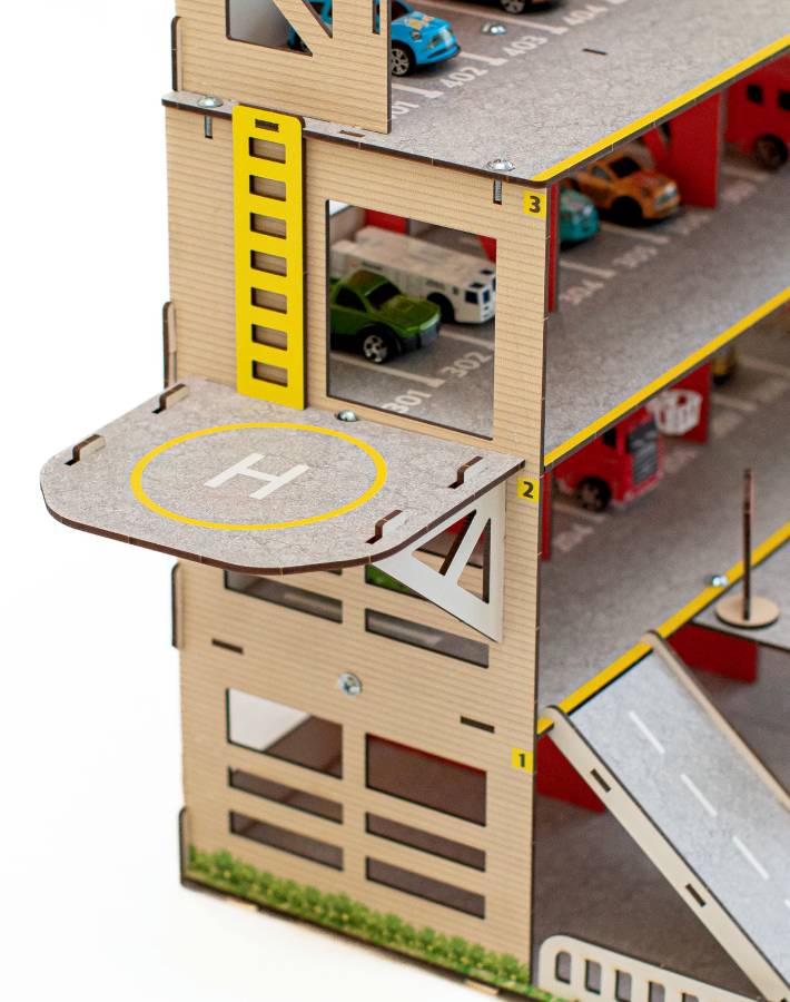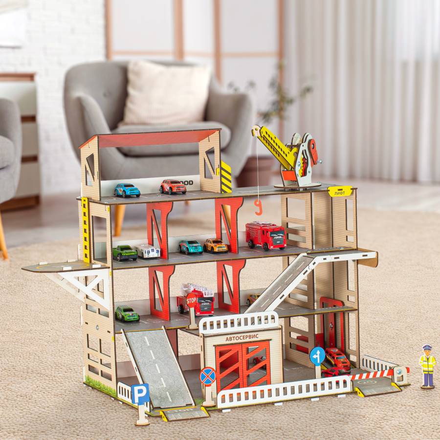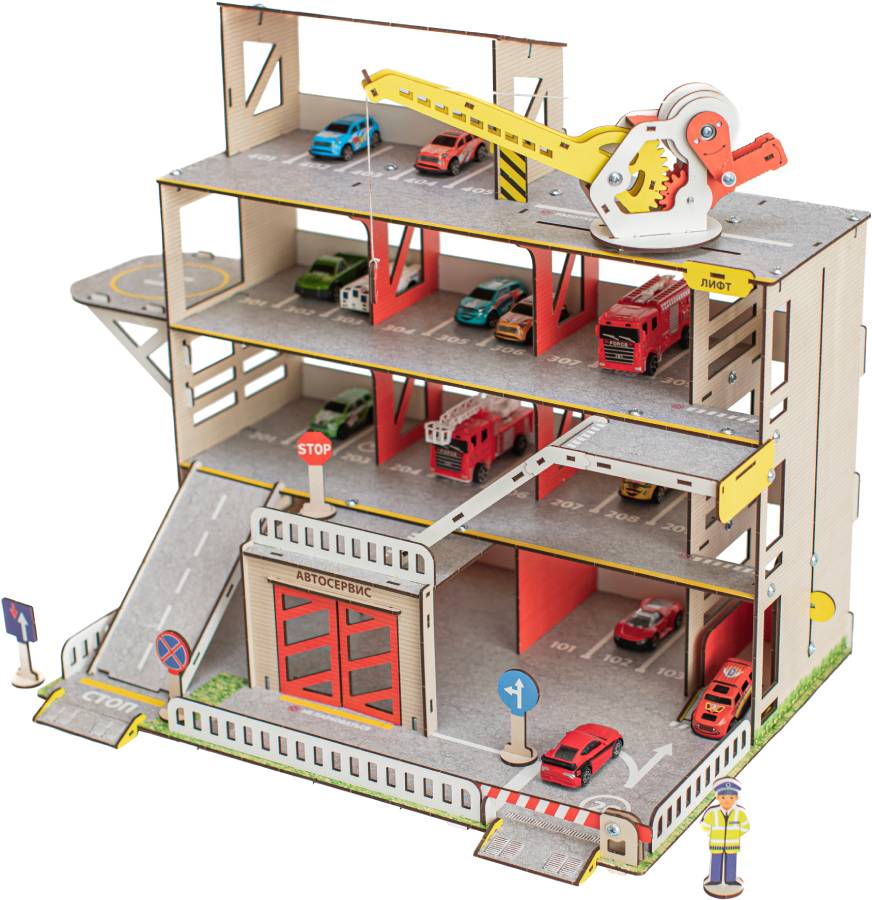 Паркинг - неотъемлемый атрибут юного коллекционера автомобилей. Паркинг имеет 4 этажа, 2 пандуса и вертолётную площадку. Для удобства перемещения машинок предусмотрен лифт, который фиксируется в любом положении. На первом этаже есть шлагбаум и большой гараж с распашными воротами. Кран полностью функционален: он может перемещаться по этажу, поворачиваться, поднимать стрелу и натягивать трос с крюком, для чего предусмотрена удобная ручка. Игрушка выполнена из настоящей древесины и покрыта красками на водной основе. Материал Дерево (Берёза) Возраст 3+ Страна производитель Россия Гарантия 1 год Сертификат безопасности RU № 0727871 Высота этажа 15 см Цветовая гамма Яркая Размер в собранном виде (см) 60х50х40 Особенности Функциональный кран, лифт, шлагбаум Количество этажей 4 Количество деталей 140 Вес упаковки 3 кг Размеры упаковки (см) 65х25х4