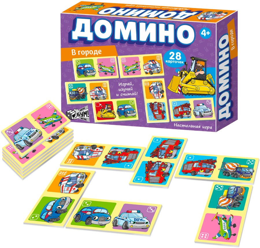 Домино – увлекательная и полезная логическая игра для детей. В наборе 28 карточек домино и правила. В процессе игры малыши научатся считать до 6-ти и выделять один объект из множества. На карточках домино изображены разные виды транспорта и спецтехники, а также точки как в классическом домино. Правила игры простые - к изображению на одной доминошке надо подобрать такое же изображение на другой. Все картинки яркие и понятные, дети смогут изучить названия машин, потренировать логику, внимание и мелкую моторику. В правилах описаны два варианта игры в домино. Количество игроков- 2-4 Возраст 4+ Материал: бумага, картон.