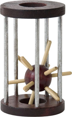Клетка с деревянной крышей и основанием, металлическими прутьями. Внутри сидит Ежик – деревянный шарик с деревянными иголками разной длины, торчащими во все стороны.