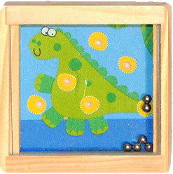 Занимательная развивающая мини-игра на равновесие и координацию: в квадратной деревянной рамочке с прозрачным пластиковым покрытием свободно перемещаются 6 металлических шариков. Их нужно закатить в луночки. Фоном является красочная картинка с изображением забавного животного.