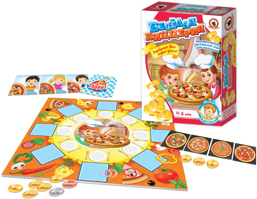 Любишь пиццу? Тогда стань шеф-поваром, открой собственную пиццерию и преврати это вкусное блюдо в увлекательный и прибыльный бизнес. Эта весёлая бизнес-игра для малышей с простыми правилами научит детей вести денежные расчёты, быть внимательными и потренирует зрительную память. Состав игры: игровое поле – 1 шт., карточки пиццы – 30 шт., карточки клиентов – 30 шт., кубик – 1 шт., монеты – 70 шт., правила игры.