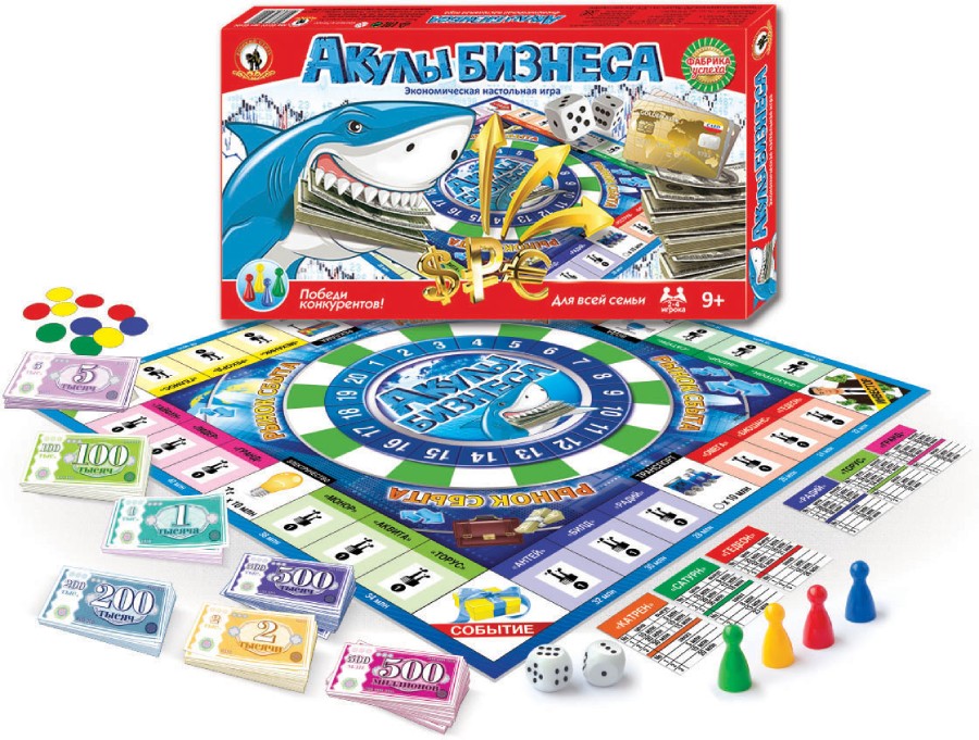 В этой увлекательной экономической игре игрокам предстоит стать главой производственной корпорации, открывать новые предприятия и завоевать рынок сбыта, беспощадно и решительно вытесняя с него всех конкурентов. Это игра для тех, кто рождён ПОБЕЖДАТЬ! Игроки смогут проявить свои лучшие деловые качества, научатся принимать верные управленческие решения, и станут хищниками финансового мира, проложив путь к успеху! Игра рассчитана на 2 – 4 игроков и предназначена для детей и взрослых. Состав игры: • игровое поле – 1 шт. • кубик – 2 шт. • фишки – 4 шт. • карточки предприятий – 24 шт. • символы предприятий – 48 шт. • карточки «кредит» – 4 шт. • карточка «инвестор» – 1 шт. • купюры – 6 листов • бланки чеков – 18 шт. • жетоны картонные – 81 шт. • правила игры