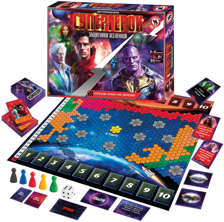 Галактика в опасности! Вражеский флот стоит у самой Земли. Супергероям нужно объединиться, чтобы защитить родную планету и спасти мир. В настольной игре «Супергерои. Защитники вселенной» игрокам предстоит уничтожать вражеских разведчиков, отражать атаки на Землю и собирать уникальное оружие, которое не позволит враждебной расе захватить планету. Это командная игра, в которой победа зависит от действий каждого участника. Чтобы спасти галактику, игрокам предстоит продумать тактику боя и эффективно использовать суперспособности каждого из игроков-супергероев. Количество игроков: 2-4 Возраст: 8+ Состав игры: игровое поле, карточки – 50 шт., фишки – 5 шт., кубик, правила. Материал: картон, бумага, пластмасса