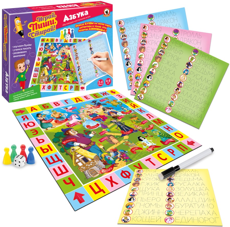 Серия игр «Играй, Пиши, Стирай» - это обучающие игры-тренажеры с маркером для детей дошкольного возраста. Развивающая игра «Азбука» развлечет малышей и принесет большую пользу – потренирует мелкую моторику, научит читать и писать буквы русского алфавита, различать звуки в составе слова, а также научит быть внимательными и аккуратными. В процессе игры дети ходят фишкой по игровому полю и обводят выпавшие буквы на своей карточке, кто первым обведет одно слово целиком, считается победителем. В состав игры входят: 4 многоразовые ламинированные карточки-прописи, игровое поле, 4 фишки, кубик, маркер на водной основе, правила. Возраст: 4-8 лет Количество игроков: 2-4 Материала: Бумага, картон, пластмасса.