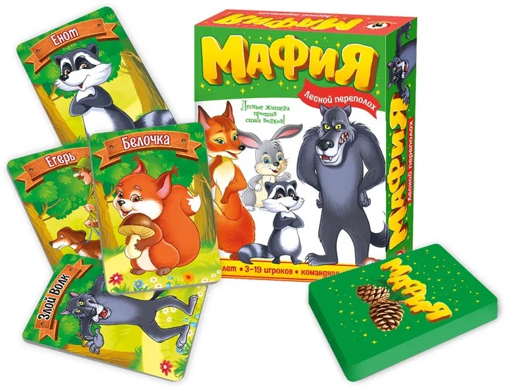 Культовая карточная настольная игра Детская мафия Лесной переполох порадует как новичков, так и опытных игроков в настольные игры среди детской аудитории. В основе этой игры лежит противоборство стаи волков и лесных зверушек под предводительством егеря. Предугадать исход игры невозможно, а участники должны вживаться в роли своих персонажей, проявлять актерские способности и блефовать. Игра заставляет вести тонкую психологическую борьбу, чтобы привести свою команду к победе.