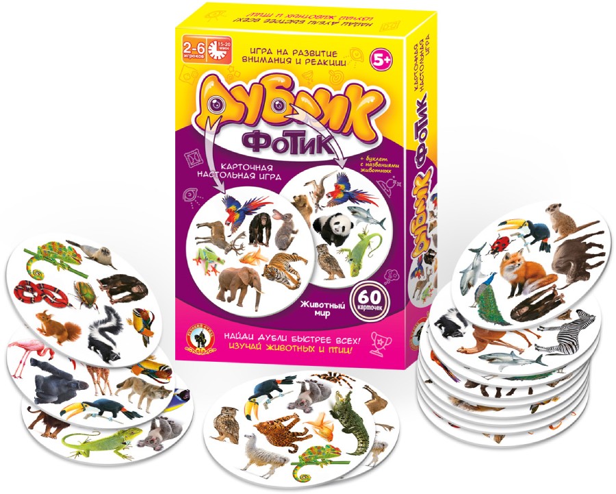 «Дублик» - это игра, которая сможет развеселить и увлечь каждого! В комплекте карточки с разным набором картинок. Игрокам необходимо найти совпадающие изображения быстрее всех. В процессе игры участники изучат новых представителей животного мира, а поможет в этом буклет-подсказка с названиями животных. В правилах вы найдете несколько вариантов игры. Память, скорость и внимание - Ваши главные помощники. Вперёд за победой! Игра подойдет для 2-6 игроков.В комплект игры входит 60 карт и правила игры.