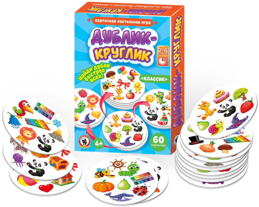 «Дублик» – это игра, которая сможет развеселить и увлечь каждого! В комплекте карточки с разным набором картинок. Игрокам необходимо найти совпадающие изображения быстрее всех. В процессе игры участники хорошо потренируют память, скорость и внимание. В правилах описаны несколько вариантов игры в «Дублик». Вперёд за победой! Игра подойдет для 2-6 игроков. В комплект игры входит 60 карт и правила игры.