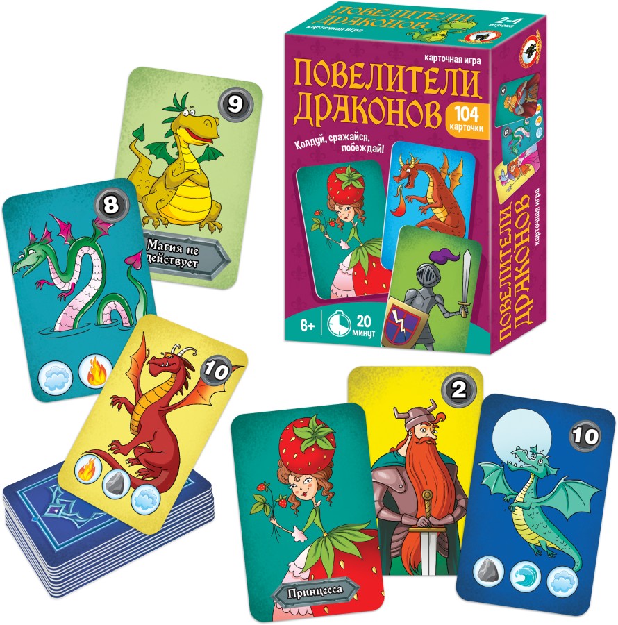 Сказочные драконы напали на королевство и похитили всех принцесс. Игрокам предстоит укротить свирепых драконов, получить сокровища, спасти из плена прекрасных принцесс и стать самыми могущественными повелителями сказочного королевства! А помогут игрокам в этом – магическая сила четырёх стихий, волшебный меч, верные рыцари, внимательность и смекалка. Количество игроков: 2-4 Возраст: 5+ Состав набора: карточки – 104 шт., правила. Материал: картон, бумага.