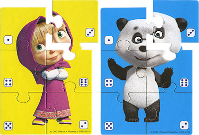 - 4 пазла с персонажами из мультфильма - Маша, Мишка, Панда и Зайчик - на своем цветном фоне