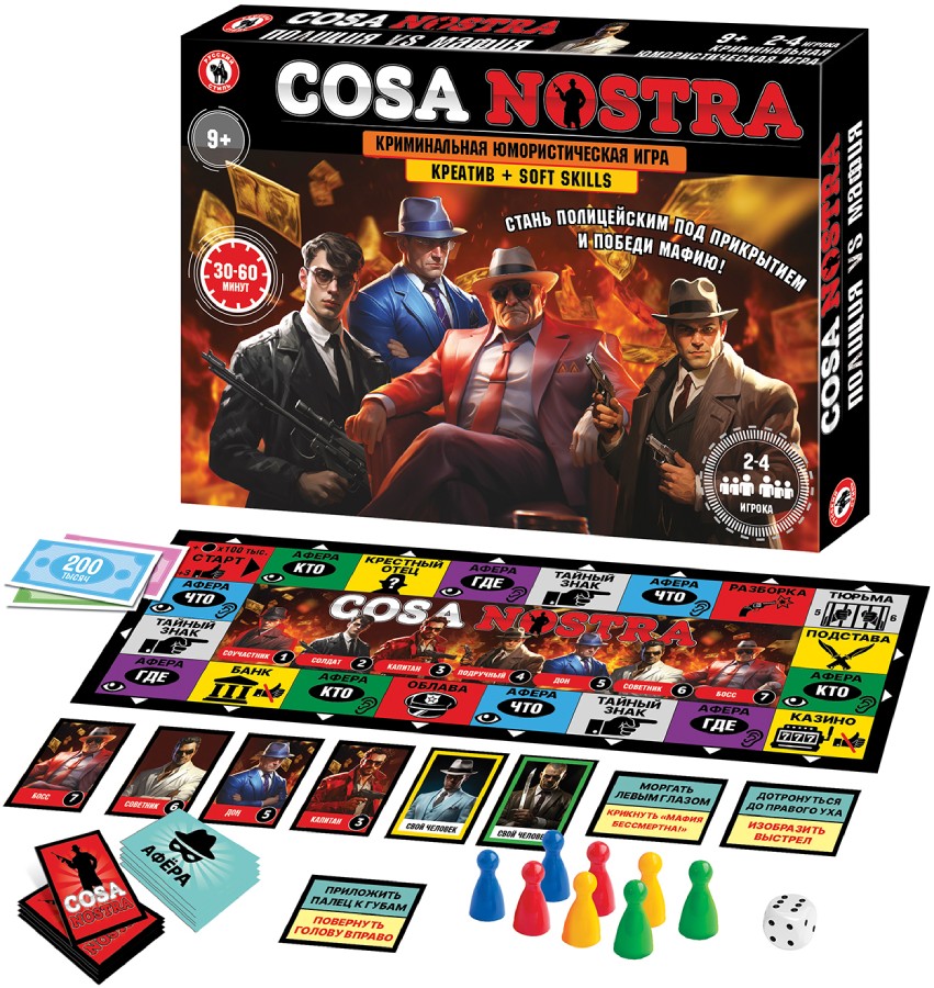 Мафия бессмертна, но и полиция не дремлет! Игрокам предстоит внедрить своих людей в сицилийскую мафию и разоблачить ее коварные планы! Игроки получают карточки с персонажами мафии, в ходе игры им предстоит встречаться с настоящей мафией, участвовать в аферах, изображать действия с помощью пантомимы: кто, где и как совершил аферу. В игре присутствуют карточки с тайными знаками, игрокам предстоит их изучить и незаметно давать друг другу тайные сигналы. Участвуя в этой увлекательной коммуникативной игре, дети и взрослые смогут продемонстрировать артистизм, смекалку и умение импровизировать. Количество игроков: 2-4 Возраст: 9+ Состав игры: игровое поле, кубик, фишки – 8 шт., карточки – 100 шт., жетоны – 40 шт., деньги – 40 купюр, правила игры. Материал: картон, бумага, пластмасса