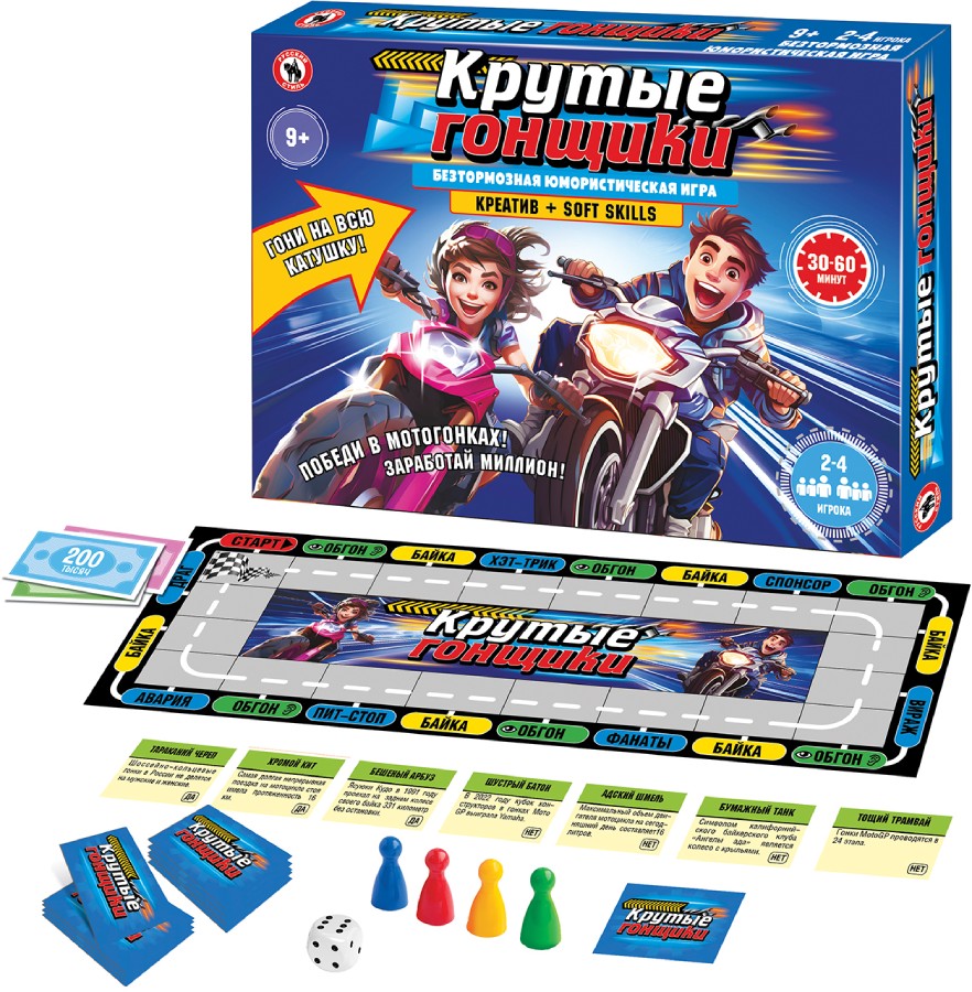 Эта игра для тех, кто без ума от бешеной скорости и крутых байков! Игроки станут крутыми гонщиками, а самый быстрый победит в гонках и заработает миллион! Участвуя в этой юмористической коммуникативной игре, игрокам предстоит не только мчаться по полной опасностей гоночной трассе, но и попутно травить байки и обгонять соперников с очень смешными прозвищами. А помимо этого, в процессе игры игроки узнают много интересных фактов о байках и мотоциклах, гонках и великих гонщиках. Количество игроков: 2-4 Возраст: 9+ Состав игры: игровое поле, кубик, фишки – 4 шт., карточки – 100 шт., жетоны скорости – 40 шт., деньги – 40 купюр, правила игры. Материал: картон, бумага, пластмасса