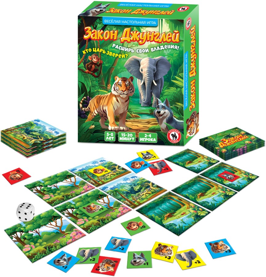 Игрокам предстоит занять как можно большую территорию в джунглях и расселить туда своих животных, набрав наибольшее количество призовых очков. Игроки выкладывают на стол карточки территорий и сверху выкладывают жетон с изображением своего животного. В процессе игры игрокам предстоит объединять свои территории, а также сражаться за территории с другими игроками. Если игрок претендует на завоевание чужой территории, то оба игрока бросают по очереди кубик, и к значению кубика прибавляют число обитающего на этой территории животного. У кого значение больше, тот победил в борьбе за землю. Игра развивает внимательность, логику и навыки устного счета. Дети легко и быстро научатся складывать и сравнивать числа. Количество игроков: 2-4 Возраст: 5-8 лет Состав игры: карточки – 36 шт., кубик – 1 шт., жетоны – 40 шт., правила игры.
