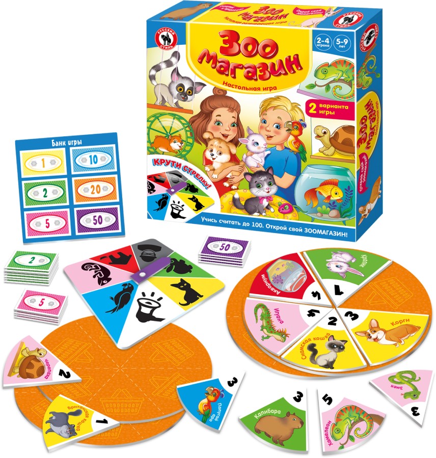Зоомагазин – увлекательная игра с денежными купюрами для любителей домашних животных. Игрокам предстоит открыть собственный зоомагазин! В процессе игры игроки покупают товары в свой зоомагазин, затем крутят стрелку рулетки, выпавшая категория товаров приносит игрокам прибыль. А дополнительные сектора: реклама и воришка – вносят азарт и непредсказуемость в ход игры. Играя, дети научатся считать от 1 до 100, потренируются в сложении, вычитании и ведении денежных расчетов, а также изучат названия животных, птиц и млекопитающих, породы собак и кошечек. Победителем станет игрок, первым заработавший 50 денежек. Возраст: 5–9 Количество игроков: 2–4 Состав игры: игровая основа – 4 шт., рулетка, карточки – 35 шт., денежные купюры – 48 шт., карточка Банк игры, правила. Материал: бумага, картон.
