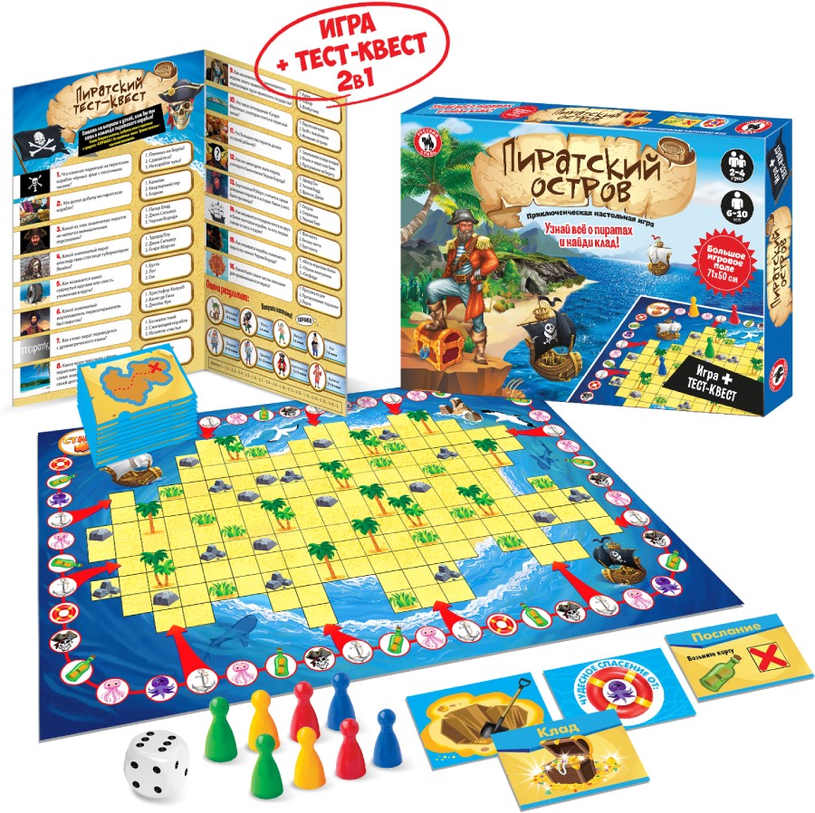 Поиски клада всегда заманивали отважных путешественников, вот и игрокам предстоит отправиться в опасное морское приключение на поиски настоящего пиратского клада. Игроки плывут на корабле, сражаются с морским чудищем, высаживаются на остров, ищут послание с картами, исследуют остров в поисках клада. Каждый новый круг игра ведется по-разному, так как клад закопан все время в новом месте, и никто не знает его местоположение. На оборотной стороне поля игроки найдут увлекательную квест-викторину с вопросами и узнают много нового о жизни и обычаях пиратов. Количество игроков: 2-4 Возраст: 6-10 лет. Состав игры: игровое поле, фишки - 8 шт., кубик, карточки - 50 шт., правила игры. Материал: картон, бумага, пластмасса.