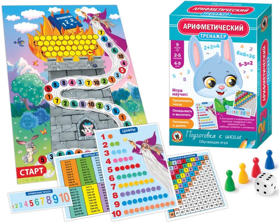 Серия обучающих игр «Тренажёры» – это эффективная многоступенчатая методика, многократно ускоряющая усвоение детьми учебного материала, изучаемого в дошкольном и младшем школьном возрасте. «Арифметический» тренажёр – это сюжетная обучающая игра, которая поможет детям сначала научиться порядковому счёту, сопоставлению цифр с количеством объектов и сравнению чисел, а затем познакомиться со сложением и вычитанием чисел в пределах 10, выучить таблицу умножения и с лёгкостью решать простейшие уравнения на сложение, вычитание, умножение и деление. Методика занятий позволяет взрослому контролировать информационную нагрузку на каждого из участников. В правилах описаны 9 видов игр разной сложности: от простого порядкового счета до решения простейших уравнений. Игра рекомендована как для индивидуальных занятий с детьми, так и занятий в группе. Для 2–5 игроков. Возраст 4 – 9 лет. Состав игры: игровое поле – 1 шт., кубик – 1 шт., фишки – 5 шт., правила игры. Материал: бумага, картон, пластмасса.