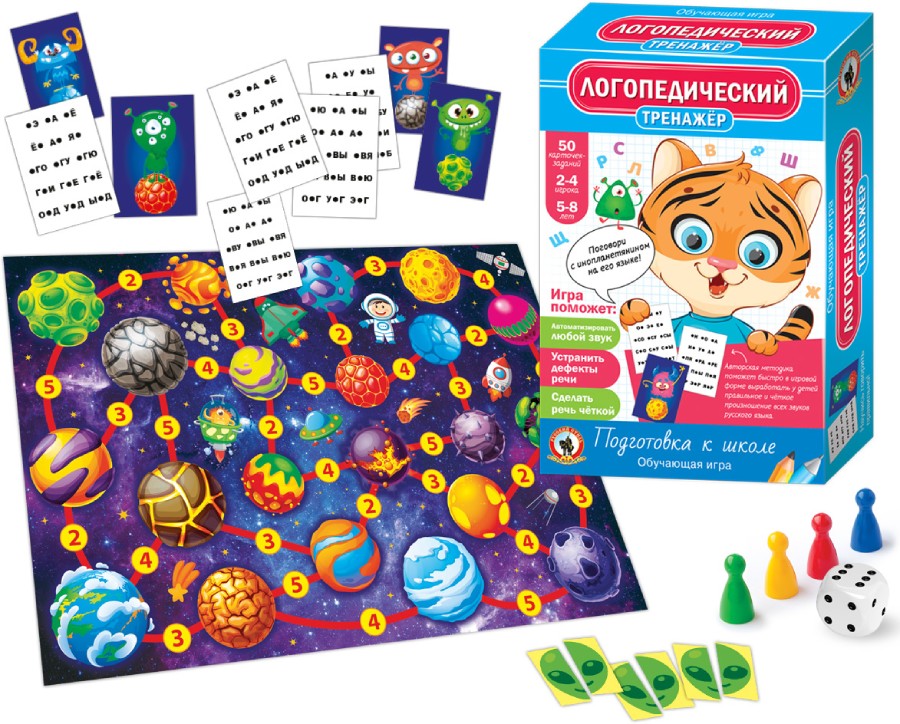 Серия обучающих игр «Тренажёры» – это эффективная многоступенчатая методика, многократно ускоряющая усвоение детьми учебного материала, изучаемого в дошкольном и младшем школьном возрасте. «Логопедический» тренажёр – это весёлая обучающая игра с понятным каждому ребёнку сюжетом и простыми правилами. Она поможет сделать речь детей чёткой, красивой и выразительной. Методика игры позволяет целенаправленно работать над автоматизацией любого проблемного звука родного языка. Игра может применяться не только для устранения существующих дефектов речи, но и для предупреждения их возникновения. Игра рекомендована как для индивидуальных занятий с детьми, так и занятий в группе. Для 2–4 игроков. Возраст 5 – 8 лет. Состав игры: игровое поле – 1 шт., фишки – 4 шт., кубик – 1 шт., логопедические карточки – 50 шт., монеты – 50 шт., правила игры. Материал: бумага, картон, пластмасса.