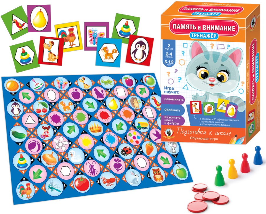 Серия обучающих игр «Тренажёры» – это эффективная многоступенчатая методика, многократно ускоряющая усвоение детьми учебного материала, изучаемого в дошкольном и младшем школьном возрасте. Тренажёр «Память и внимание» разовьёт у детей зрительную и слуховую память, что поможет успешнее учиться в школе, тратить меньше времени на выполнение домашних заданий и никогда не волноваться на контрольных и экзаменах. Игра поможет повторить такие темы, как обобщающие слова, цвета и геометрические фигуры. Игровое поле представляет собой двухуровневый лабиринт, выбраться из которого помогут память и внимание. В комплект входит 30 обучающих карточек с картинками, цветами и геометрическими фигурами. В правилах описаны два вида игры: для развития зрительной памяти и для развития слуховой памяти. Игра рекомендована как для индивидуальных занятий с детьми, так и занятий в группе. Для 2 – 4 игроков. Возраст 5 – 12 лет. Состав игры: игровое поле, фишки – 4 шт., карточки – 30 шт., жетоны – 30 шт., правила игры. Материал: бумага, картон, пластмасса.