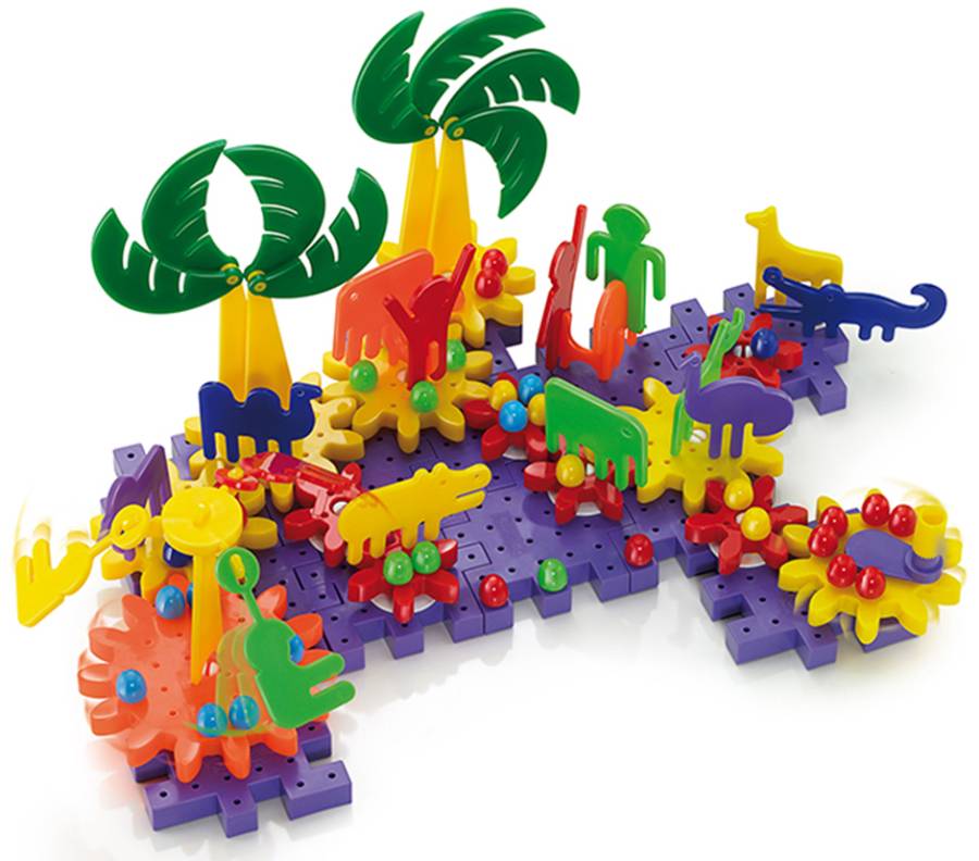 - ребенок собирает различные варианты пространственных композиций из деталей основы - модели Зоопарка, размещает на них шестеренки, затем расставляет животных, человечков и деревья