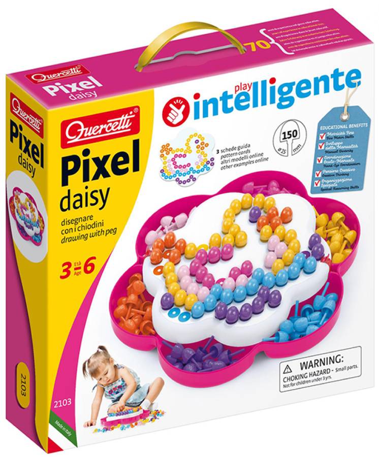 Мозаика Pixel Daisy предоставит малышу возможность проявить свою фантазию в полной мере и создать яркие красочные картинки из деталей 6-ти цветов: желтого, оранжевого, голубого, фиолетового, ярко-розового и светло-розового В комплекте: 150 деталей (D 15 мм) игровое поле в виде цветка лоток с разделителями буклет с образцами картинок Возраст: от 3 лет Материал: пластик Элементы можно мыть Страна происхождения: Италия