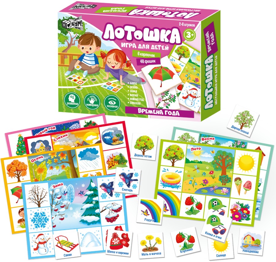 Лотошка – незаменимый помощник в развитии ребенка и формировании его кругозора. Набор «Времена года» включает в себя 6 карточек-основ, 48 фишек, правила. Правила игры простые: игрокам раздаются карточки, а ведущий по одной достает фишки и громко произносит, что на них изображено, тот игрок, у кого есть эта картинка, забирает ее себе. Кто первый закроет все изображение на своей карте считается победителем. В процессе игры дети изучат времена года, запомнят, какие природные явления свойственны каждому из них. А также малыши познакомятся со стихиями и праздником Новый год. В правилах описаны 4 варианта игры с карточками из данного набора. Количество игроков – 2-6. Возраст 3+ Материал: бумага, картон.