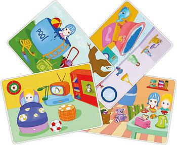 - 2 игровых поля для сортировки предметов: игрушки и электроприборы - на первом этапе игры ребенок на основе карточек-образцов заполняет недостающими элементами игровые поля, представляющие собой изображения домашней обстановки. Данный этап игры можно проводить в 3-х вариантах, постепенно усложняя задачи